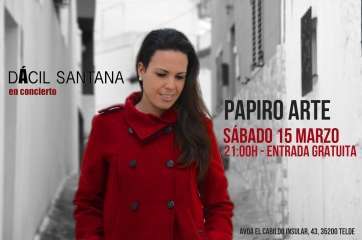Telde.- Papiro Arte de Telde contará este sábado, 15 de marzo, con la actuación en directo de Dácil Santana. Acompañada a la guitarra por Noa Hernández, la cantautora grancanaria ofrecerá a partir de las 21.00 horas una velada musical en este pub teldense ubicado en el número 43 de la Avenida del Cabildo. La entrada es gratuita.