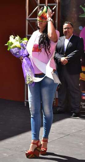 4- Yoselin Medina Cabrera, de 20 años de edad y vecina del Valle de Jinámar (Telde), representando a la comparsa Cubatao, con la alegoría Satisfacción, diseñado por Tito Cabrera.