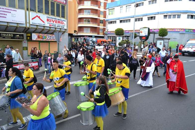 La música de la comparsa Lianceiros y de la batucada Samba Isleña, los primeros en la cabecera, aportó un toque alegre y diferente al séquito funerario durante todo el trayecto de algo más de 90 minutos y animó al público a sumarse a él hasta el recinto verde de San Juan, donde llegó a congregarse un millar de personas para asistir a la combustión de la galáctica sardina bajo el control de una unidad de bomberos del parque zonal de La Garita y de voluntarios de Protección Civil.