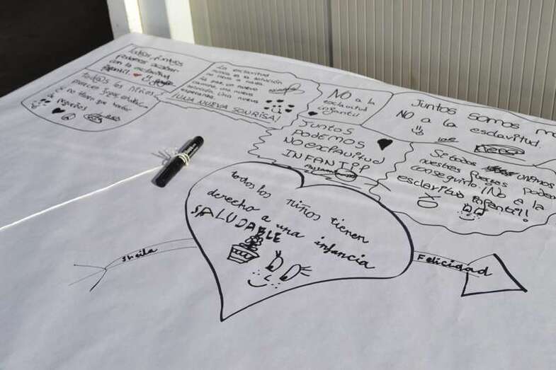 En la zona de juegos del recinto público de San Juan se desarrollaron varias actividades como la elaboración de una pancarta con mensajes reivindicativos y talleres de juegos solidarios, poesía, globoflexia, pinturas y papiroflexia, entre otros, mediante los cuales los menores expresaron su rechazo al empleo de niños en trabajos forzosos.