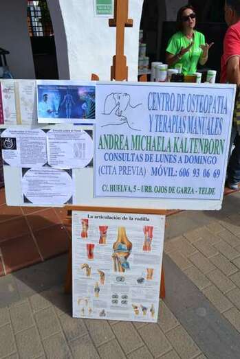 Participantes de la XX Feria de la Salud de Telde: Concejalía de Agricultura, Andrea Kaltenborg (centro de Osteopatía y terapias manuales), Asociación Cuatro Puertas, La Tirijala, Gabinete Danele, Shiatsu, Nu Skin, Centro Médico Arnao, Concejalía de Sanidad, Balance Naturopatía-Fenaco, Escuela de Gestalt de Gran Canaria, centros de salud, Herbalife, Asociación de Cocineros, Reposteros y Panaderos de Gran Canaria Mojo Picón, Flodesin, Adigran, Fundación Eroski, Decathlon, Asorgran, Accu, Radio Ecca y Aecc.