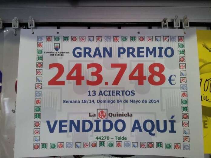 Telde.- El Bazar Quintana de El Calero ha vuelto a repartir fortuna y en esta ocasión son 243.748 euros. Un boleto con 13 aciertos de La Quiniela ha sido sellado en estas instalaciones, ubicadas en la calle Maestro Nacional, 16. Entre los premios entregados por este despacho se encuentra un pleno al 15 en enero de 2012.
