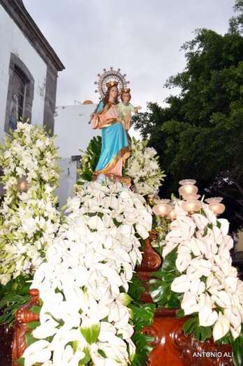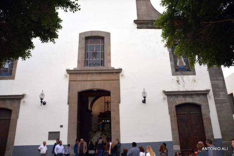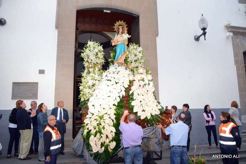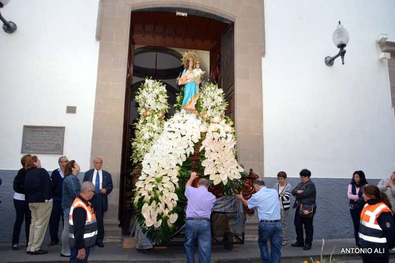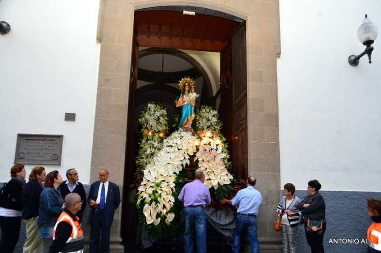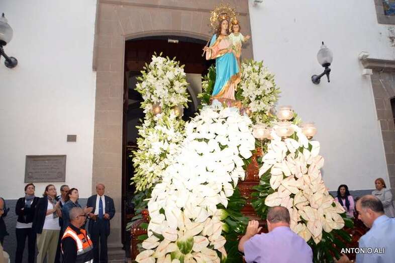 El trono con la imagen de la venerada imagen, trasladada desde el Colegio de María Auxiliadora a la Iglesia de San Gregorio para celebrar esta festividad, salió en procesión como todos los años por las vías principales del núcleo comercial en dirección al centro educativo, acompañado de antiguas alumnas y de un amplia comitiva de estudiantes y profesores del colegio salesiano de Telde.