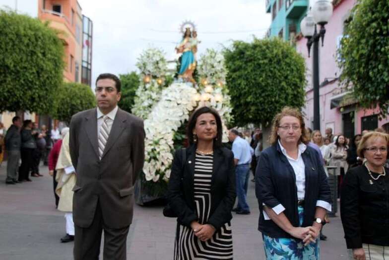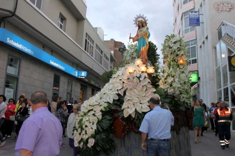 Terminada la eucaristía oficiada por el párroco D. Luis Marrero se inicia la procesión presidida por la Alcaldesa Da. María del Carmen Castellano, Concejales, y Consejeros del Cabildo grancanario, Banda Municipal de Música de Telde y un séquito de fieles devotos de la Virgen María Auxiliadora. El trono precedido por varios grupos de escolares de diferentes niveles del alumnado de la misma institución religiosa salesiana, con abanderados que portaban banderas regionales, de la Comunidad Canaria y de Telde, representaciones de María Auxiliadora, enmarcaron el recorrido con cánticos, rezos y vítores a la Virgen, perfectamente guiados y vigilados, cerrando el séquito procesional un numeroso grupo de devotas ataviadas con mantilla negra, peineta y broche, y jóvenes con mantilla canaria.