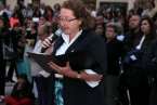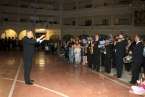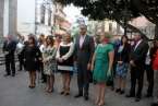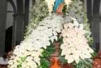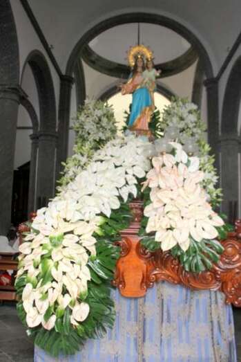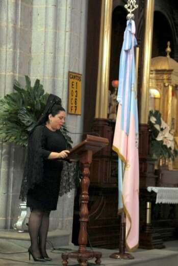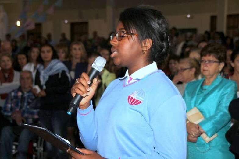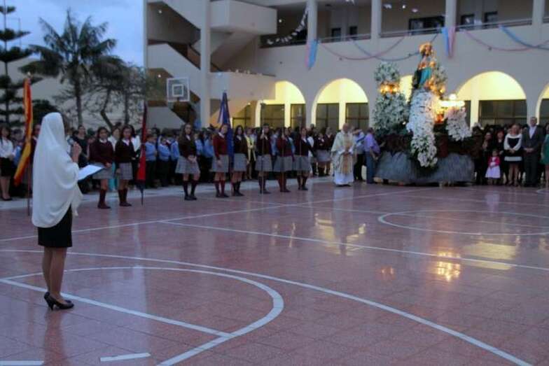 Después de la entrada del trono en el gran patio central y ubicado en un lateral, se entonaron cánticos de bienvenida, la directora de la Casa Salesiana y centro religioso, Da. Virginia recitó un poema a la Virgen María Auxiliadora: “A tu casa llegas Madre,/ tu familia te esperaba./ Las puertas de par en par y un repique de campanas/anuncian que ya está aquí la reina más salesiana./ Vienes llegando María, sorprende verte tan guapa./ De las flores, la mejor y vas dejando a tu paso la fragancia/ de tu alma sencilla, dócil, cercana. Eres la Madre de Dios,/el Arca de la Alianza entre la tierra y el cielo,/ la Casa de la Palabra, morada del Verbo eterno./ Vienes radiante María, de encontrarte cara a cara/ con la gente de este pueblo y el clamor de sus entrañas./ Unos te piden trabajo, otros salud y bonanza./ Consuelo, esperanza, sentido para seguir caminando al calor de tu mirada./ Llena de tus bendiciones esta Casa Salesiana./ Cada niño, cada joven, cada familia que pasa aprende a decir tu nombre/ y pone en ti su confianza./ Quédate junto a nosotros, alentando nuestra marcha./Sigue sembrando, aquí en Telde, esa entrega apasionada/ comunión en la misión y anuncio de la Palabra./ Bienvenida María, queremos tenerte cerca,/ tu auxilio nos hace falta./