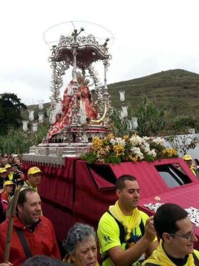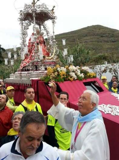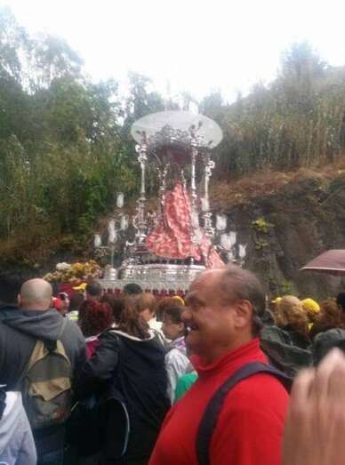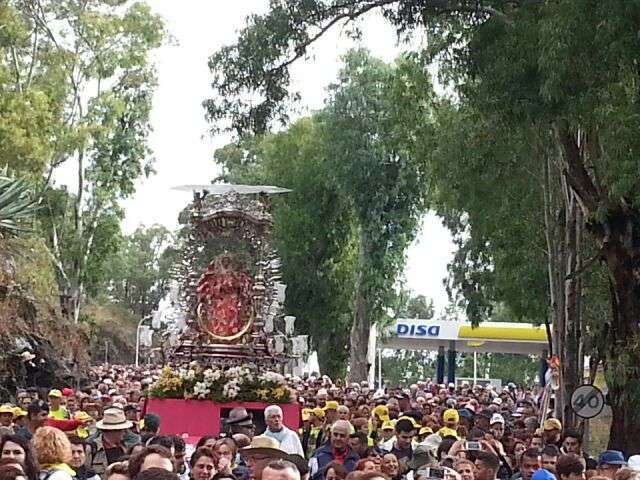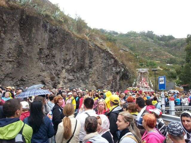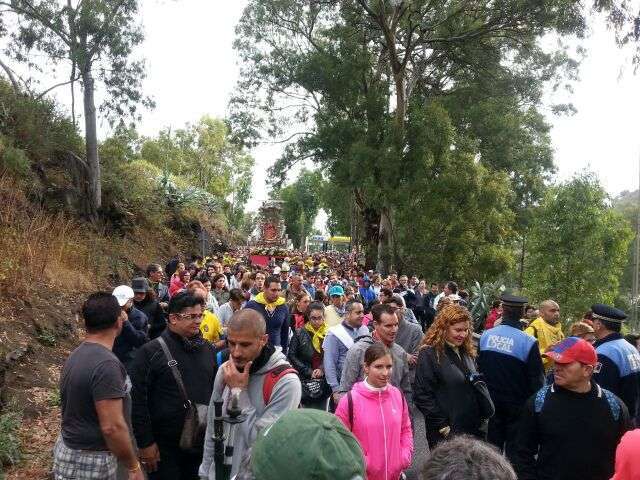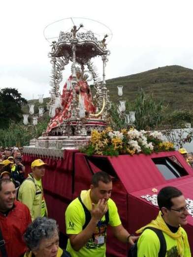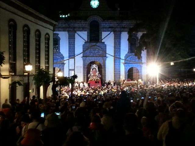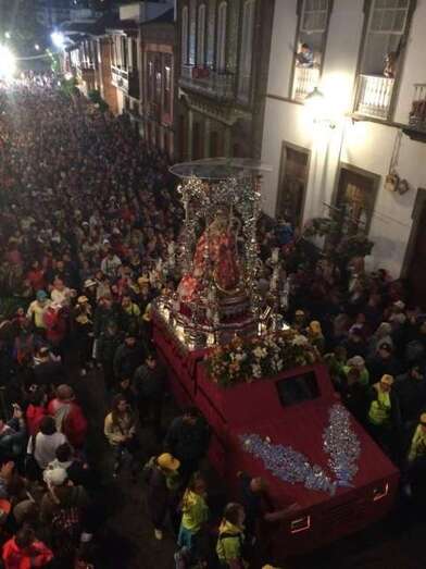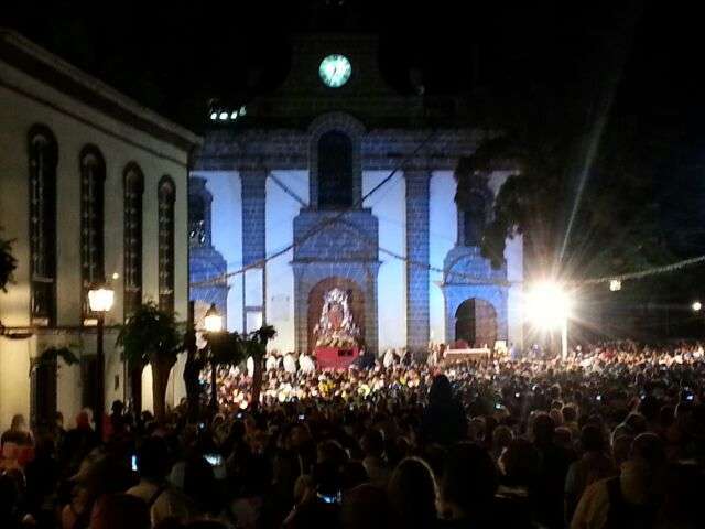 Desde medianoche, los alrededores de la basílica de Teror estaban ya rodeados de centenares de fieles a "Pinito", como cariñosamente se conoce a la isla a esta imagen de la Virgen, preparados para acompañarla a pie en los cerca de 25 kilómetros de recorrido que la separan de la catedral de Santa Ana, en la capital.