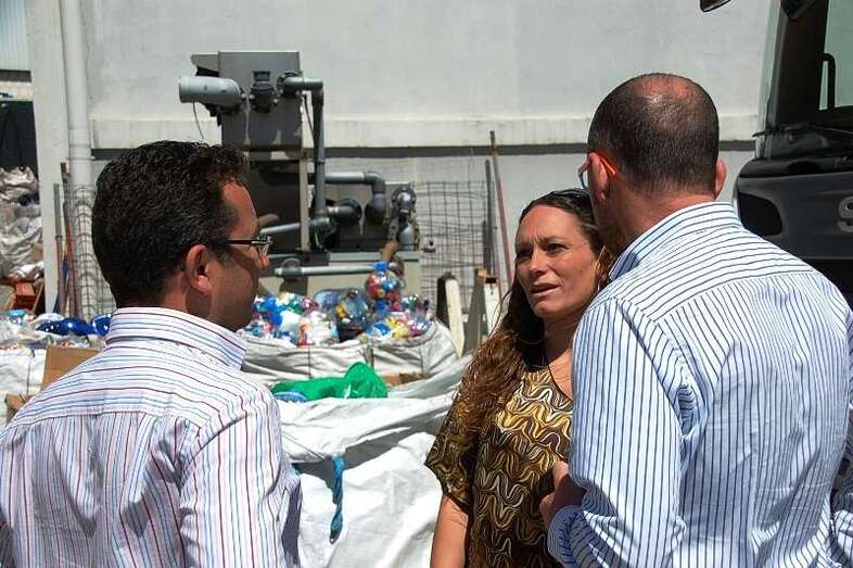 Álamo visitó las instalaciones en compañía de Iraitza en compañía de su presidenta Jessica Benítez y pudo comprobar en el espacio habilitado al Sur de la fábrica de Plascan el trabajo que desarrollan los miembros de la asociación para la recogida de tapones de plástico que son reciclados en esta instalación industrial.