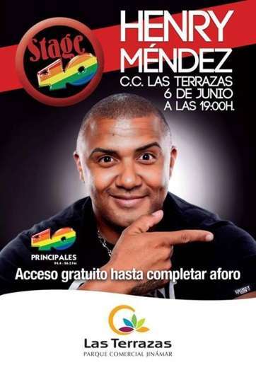 Telde.- El artista internacional Henry Méndez ofrecerá este viernes un concierto gratuito en el Centro Comercial Las Terrazas de Telde. El espectáculo, organizado por la conocida cadena musical Los 40 Principales, comenzará a partir de las 19.00 horas en el auditorio de este espacio de compras y ocio del municipio.
