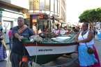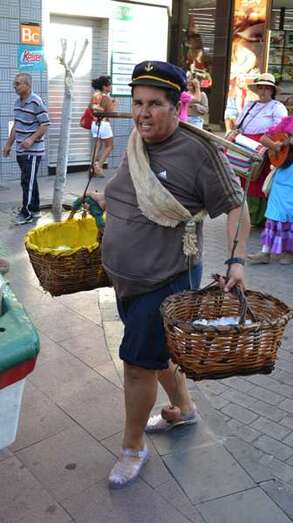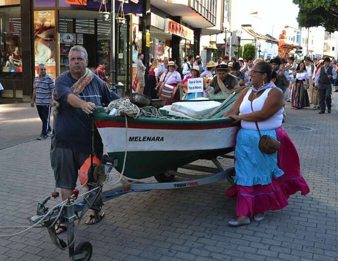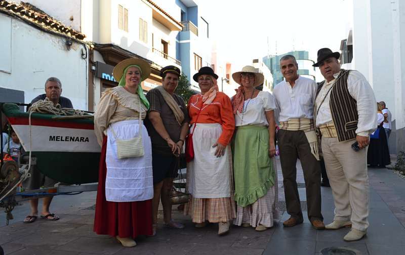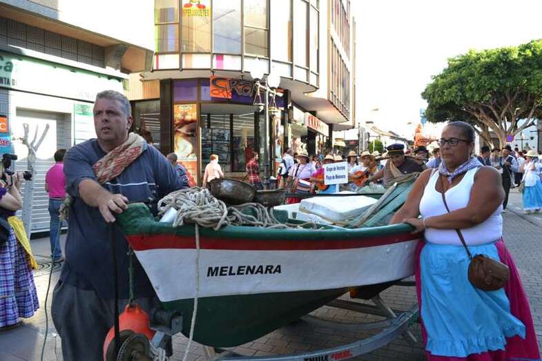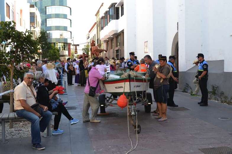 Una barca de los pescadores de Melenara encabezaba la comitiva. Iba sin acompañamiento musical, pero sí contaba con una vendedora ambulante, Carmen Rosa Santana, expresidenta de la Cofradía de Pescadores de Taliarte, que recordaba el viejo oficio ya desaparecido de la venta del pescado por las calles de Telde.