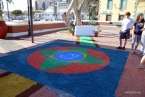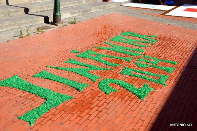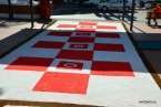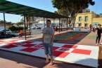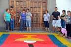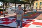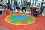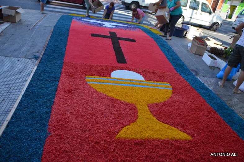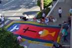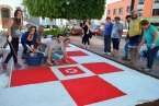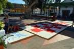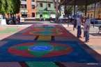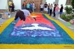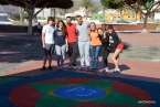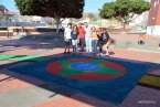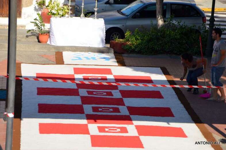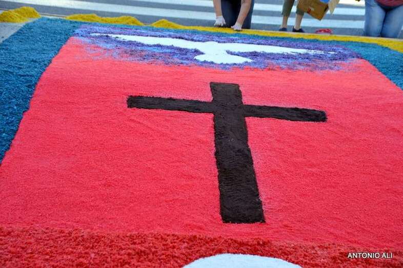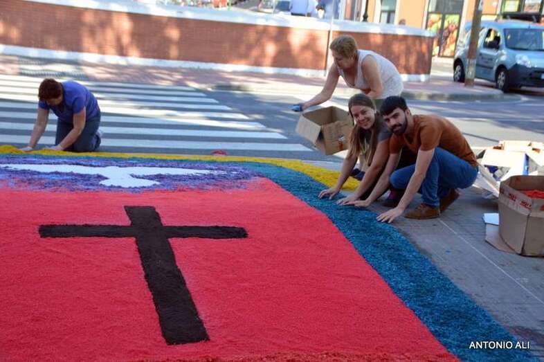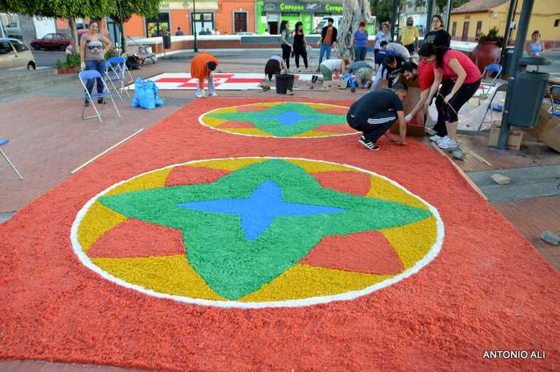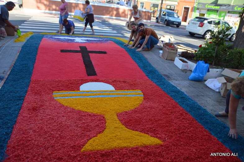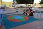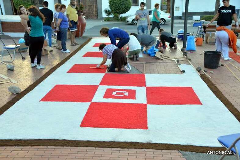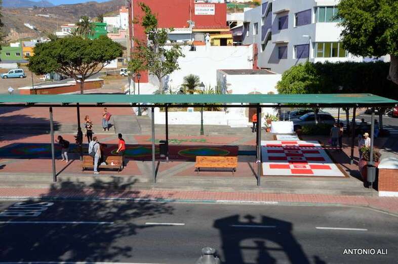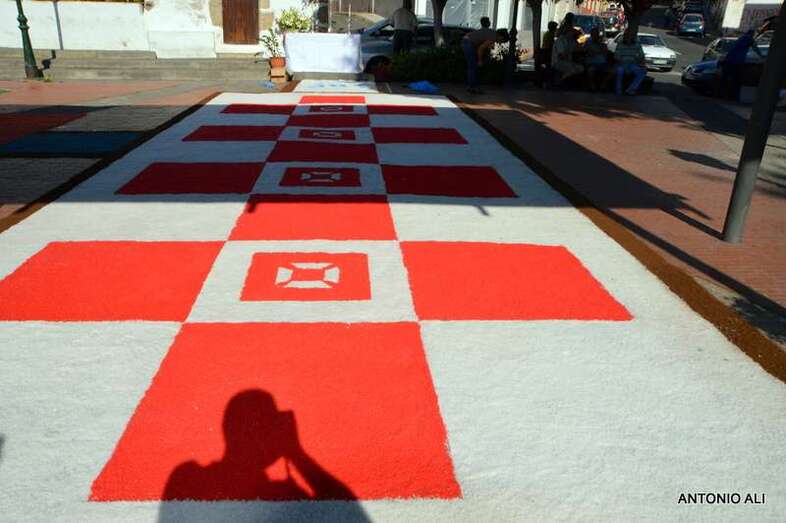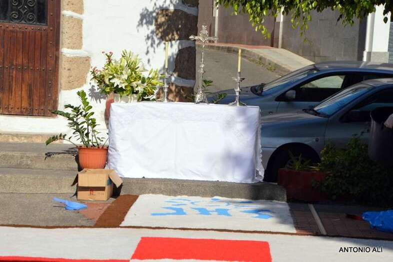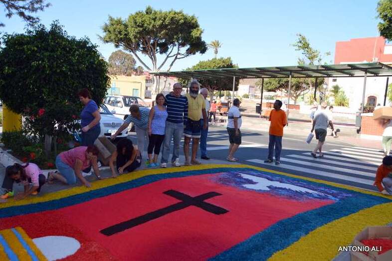 La elaboración comenzó muy pronto. A las 6.30 horas de este domingo, día 22 de junio, comenzaron los trabajos de confección de las alfombras multicolores con signos religiosos, empleándose para ello materiales diversos, en la acera situada delante de la fachada principal del tempo y en la plaza pública del casco antiguo de Jinámar.