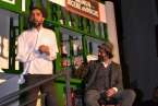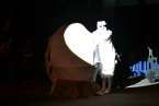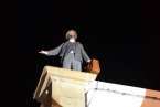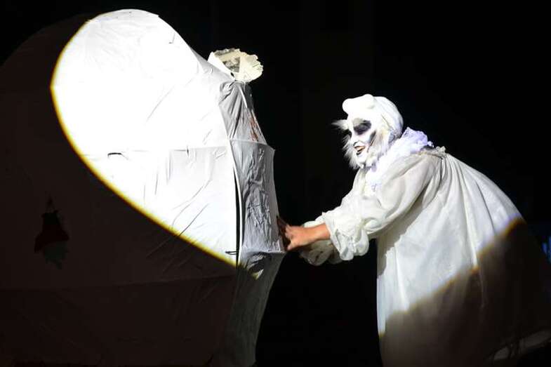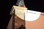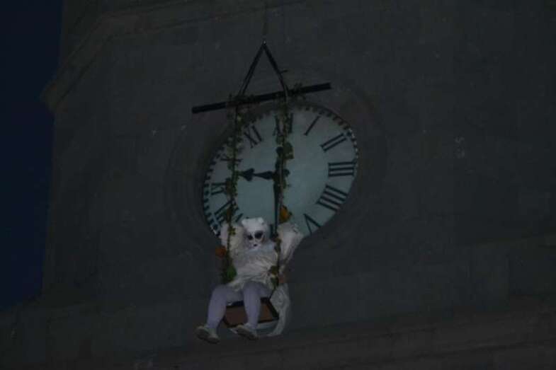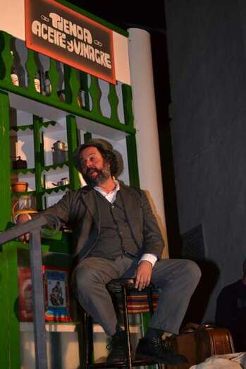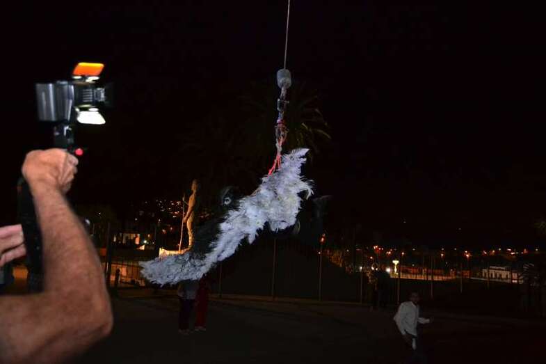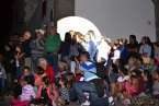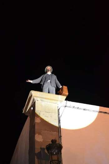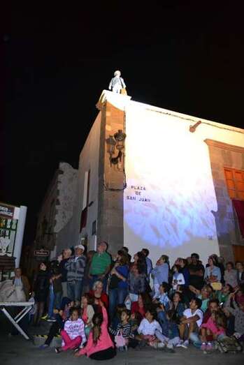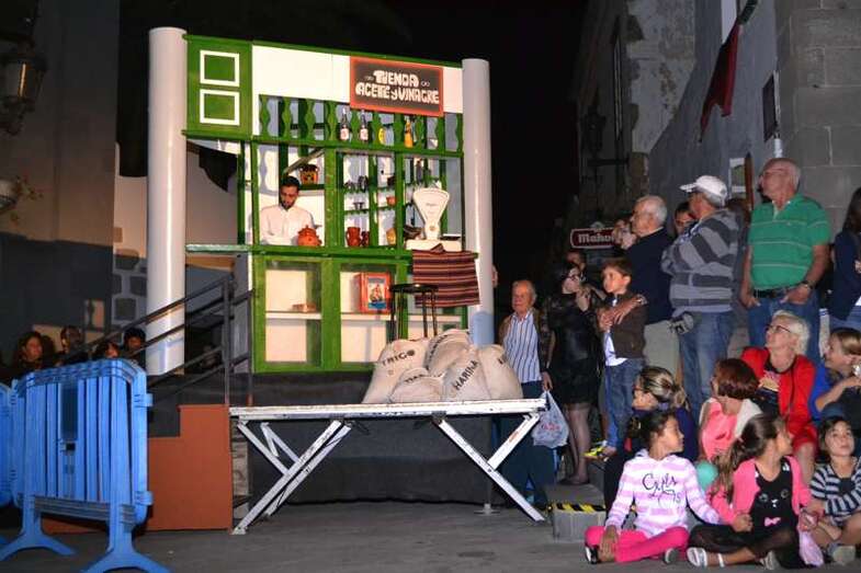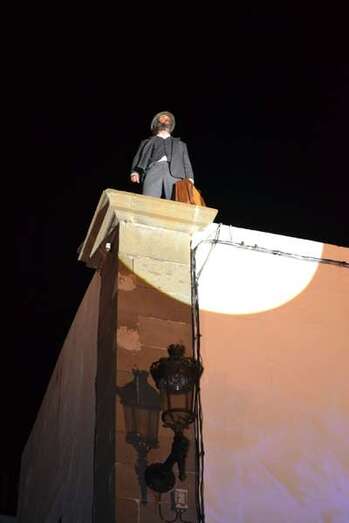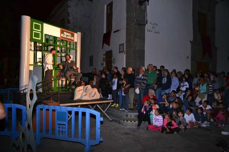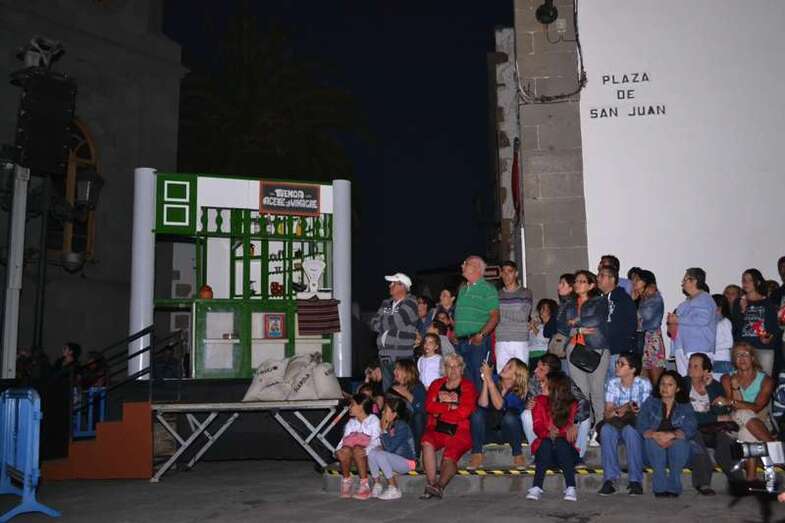 La plaza de San Juan fue el epicentro de este espectáculo que comenzó minutos antes de las 22.00 horas y que tuvo a Felipe Salas como protagonista. Un viajero sabelotodo que después de muchos años regresa a su tierra y mientras celebra la gesta acompañado por un viejo amigo en una tienda de aceite y vinagre desprecia las tradiciones de la noche sanjuanera, lo que desencadena la ira de un personaje que no le perdonará la ofensa y que desde lo alto de una de las torres de la Basílica Menor desciende para darle un escarmiento ayudado por toda una corte de personajes malignos.