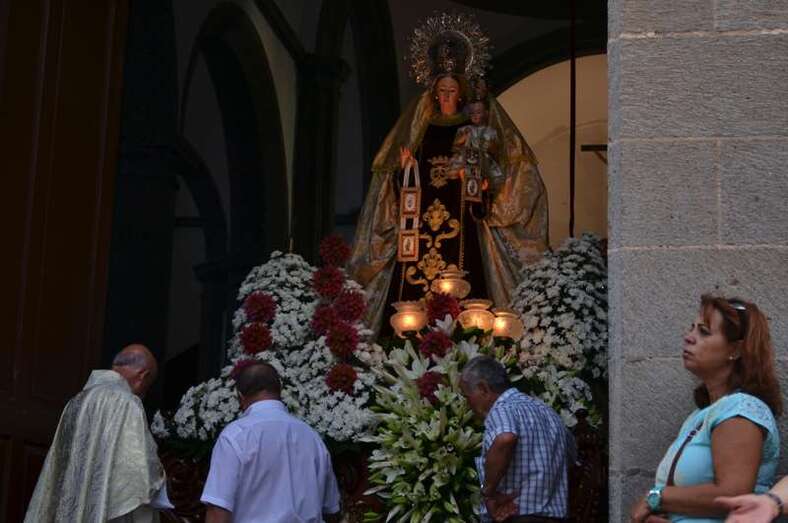 Instalado en el lateral de entrada, bajo las naves de San Gregorio Taumaturgo, el trono que portaron como costaleros guía Juan Marrero Déniz, Francisco Rivero, José Manuel Monzón, José Luis Cabrera y Sergio Mendoza Jiménez, para tomar las últimas instantáneas de un bello cuadro religioso, una Virgen muy venerada en el secular Telde de historias marineras que se remontan en la noche de los tiempos.