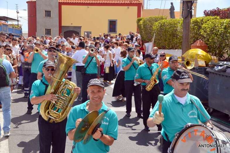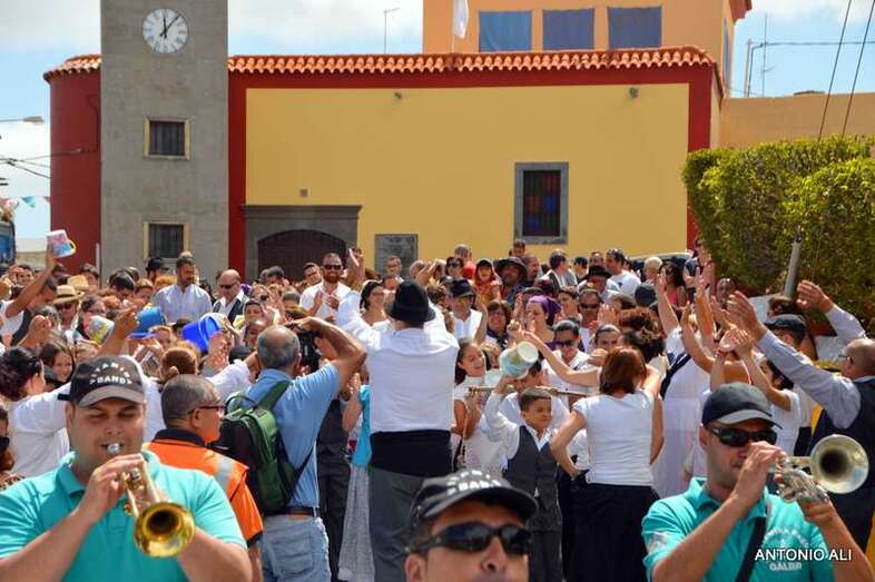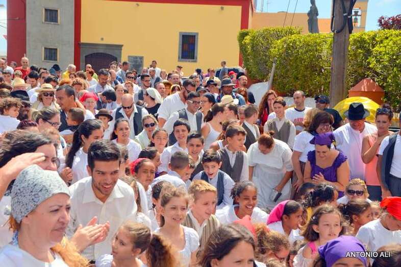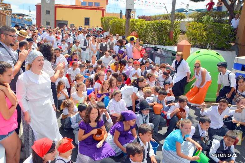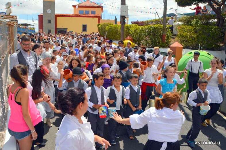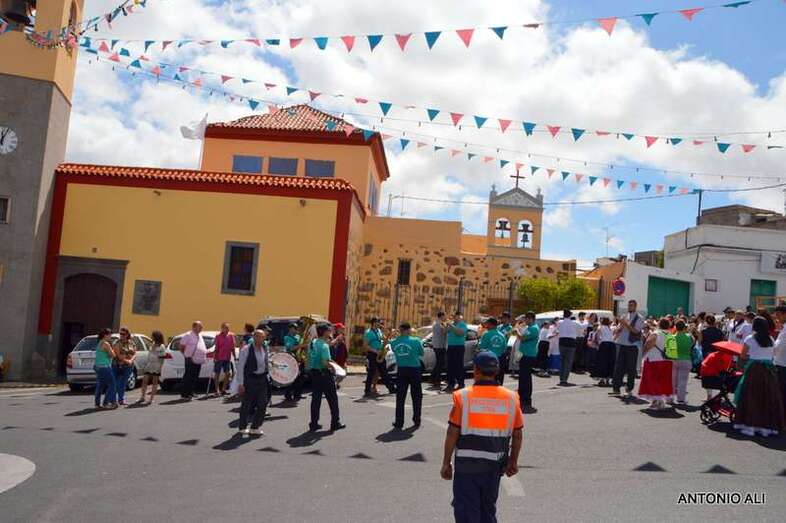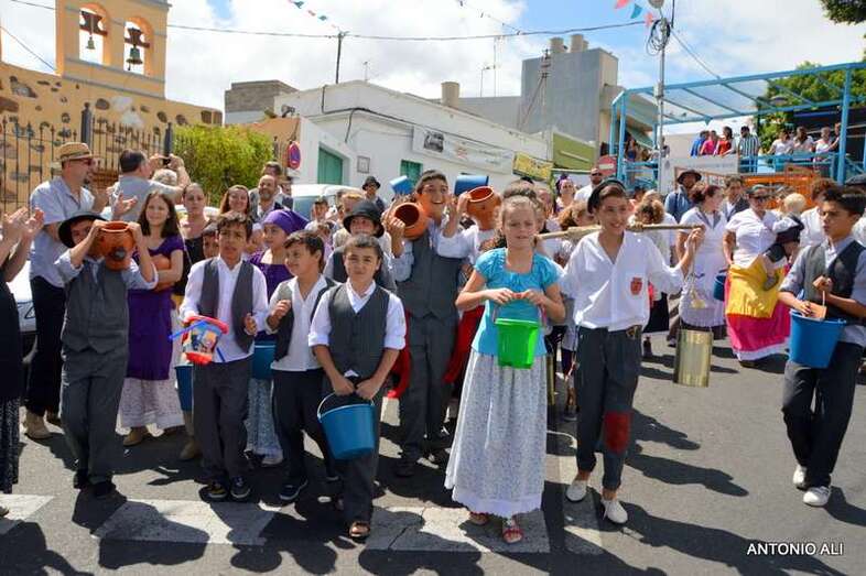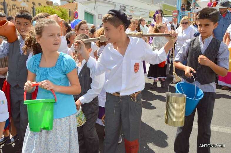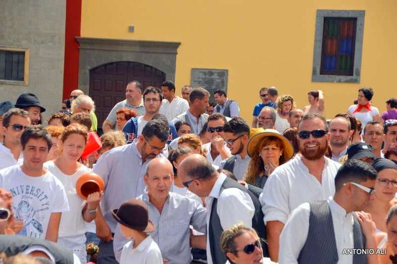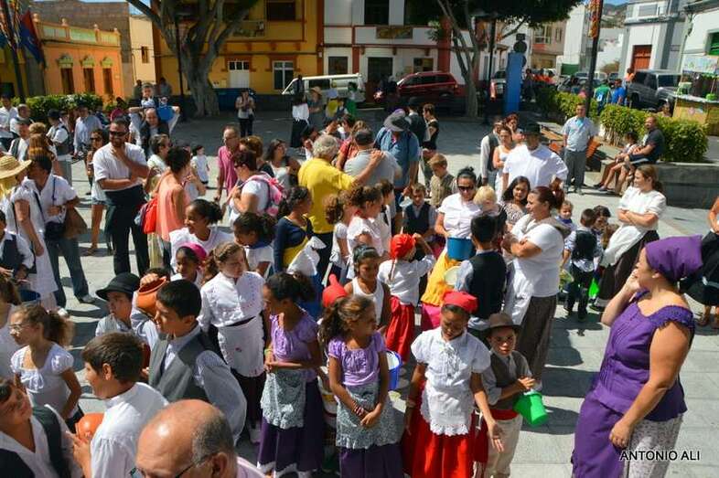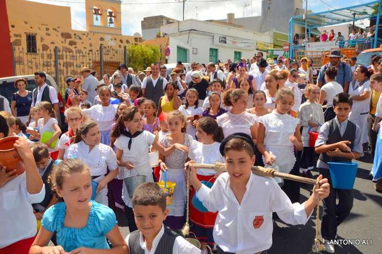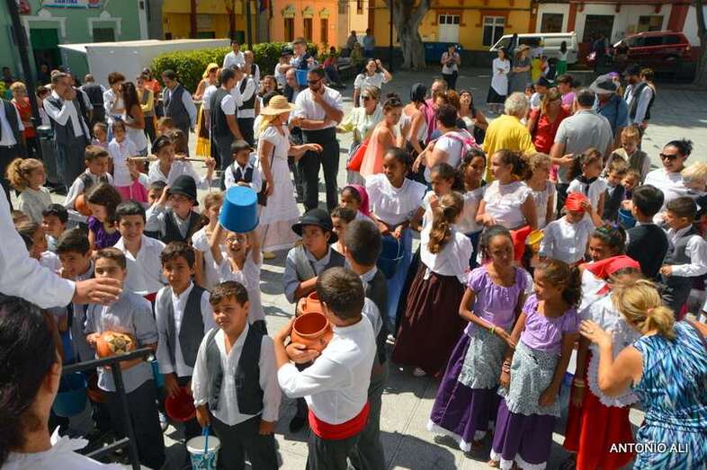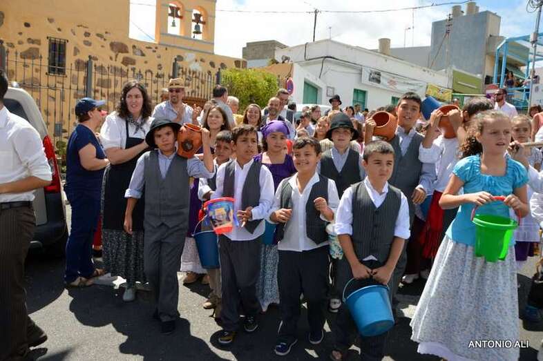 Al filo de las 12 del mediodía, cientos de personas se concentraron en las inmediaciones de la plaza del pueblo más un nutrido grupo de pequeños, vestidos con la indumentaria típica canaria y con baldes y tinajas para empapar a sus amigos, esperando a que la Banda Vitamina Band, de Gáldar, se pusiera a tocar para comenzar la bajada hasta la acequia.