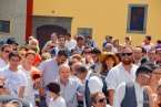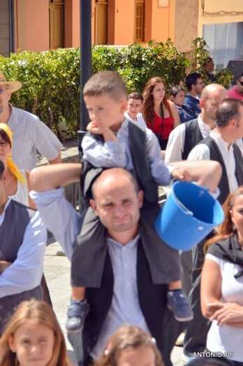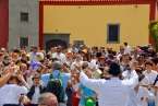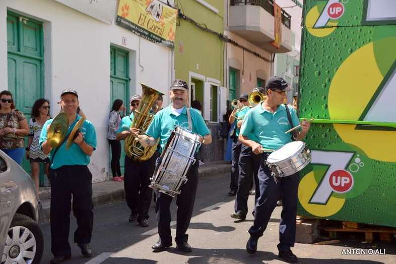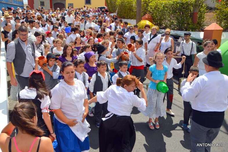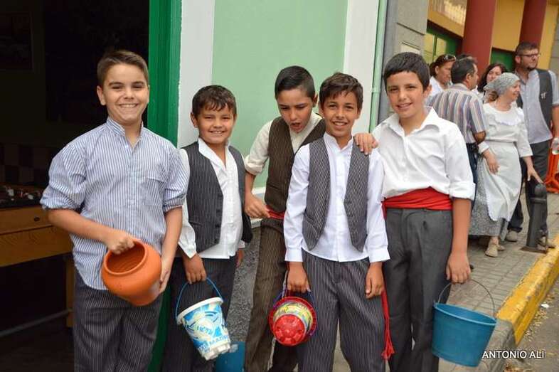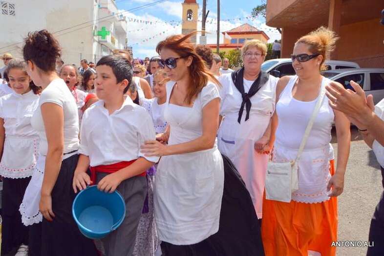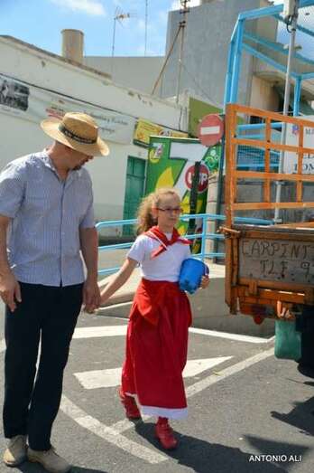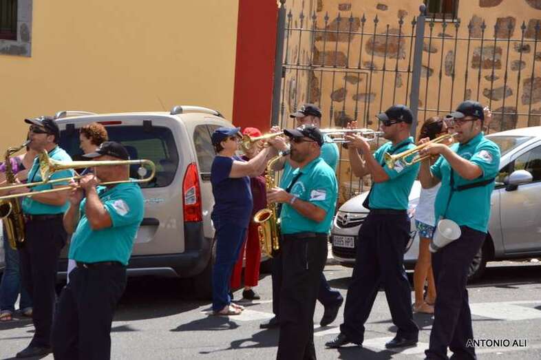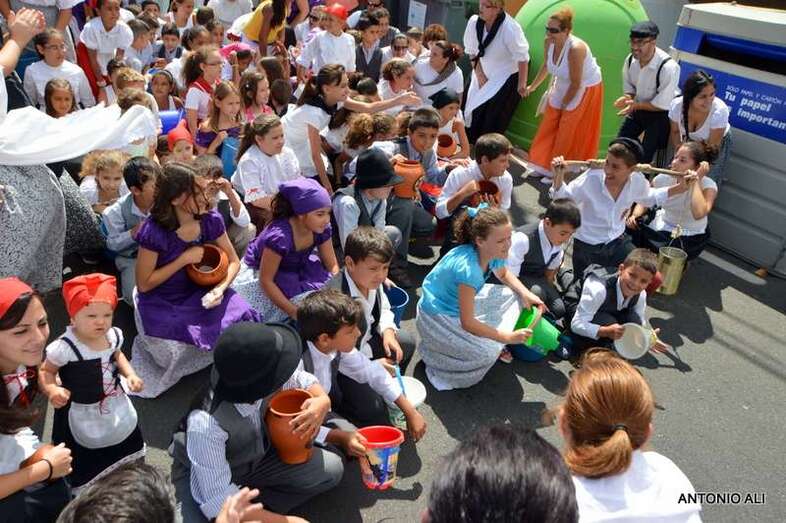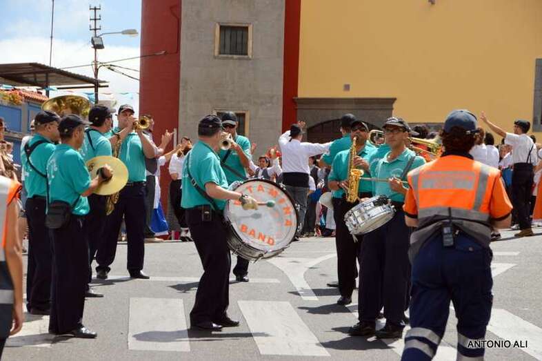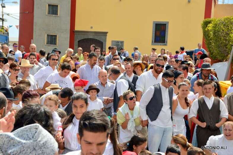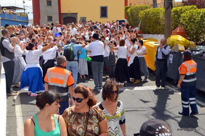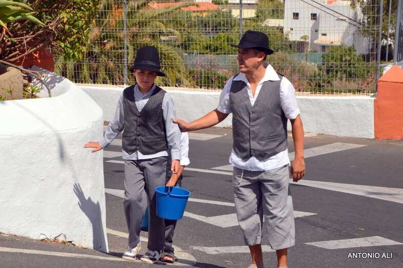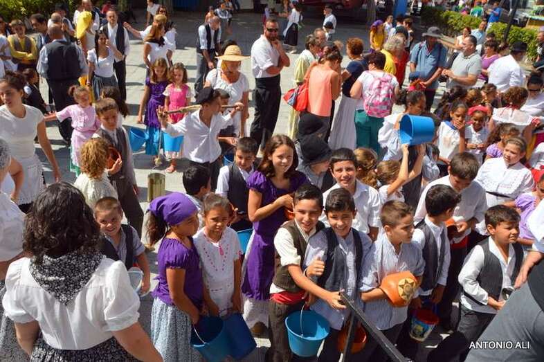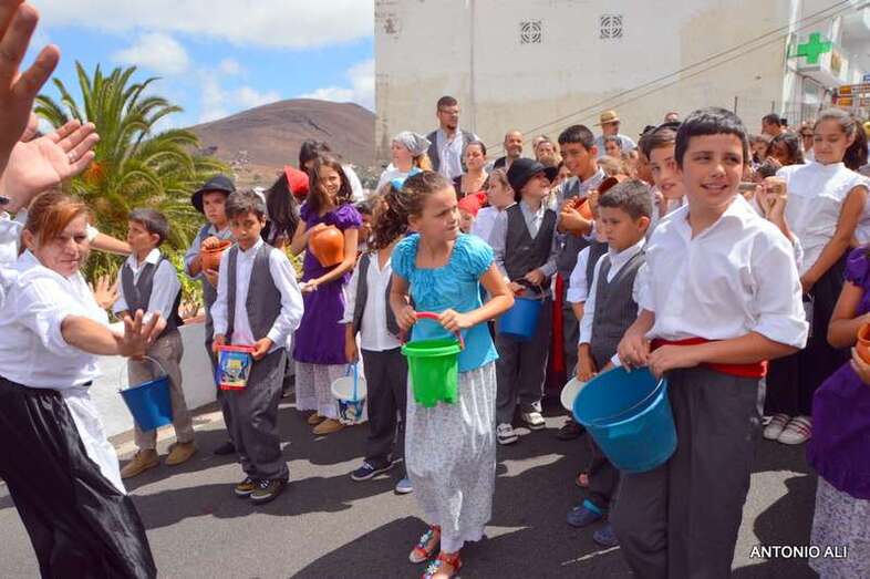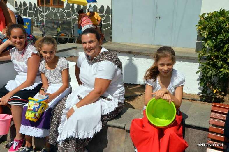 Al filo de las 12 del mediodía, cientos de personas se concentraron en las inmediaciones de la plaza del pueblo más un nutrido grupo de pequeños, vestidos con la indumentaria típica canaria y con baldes y tinajas para empapar a sus amigos, esperando a que la Banda Vitamina Band, de Gáldar, se pusiera a tocar para comenzar la bajada hasta la acequia.