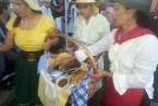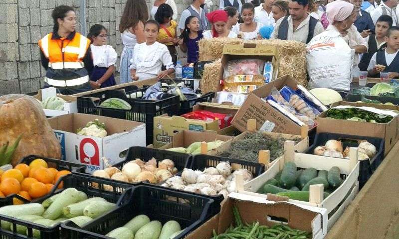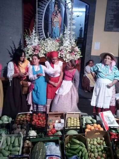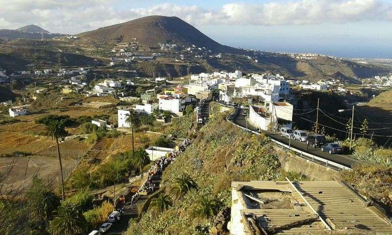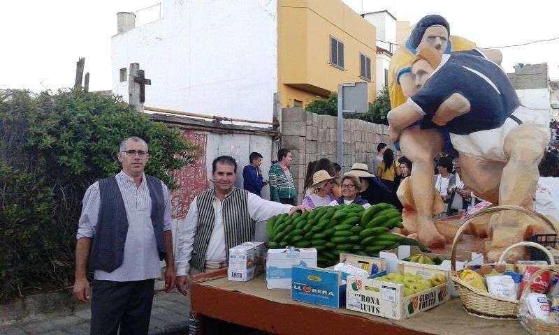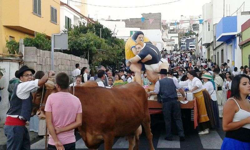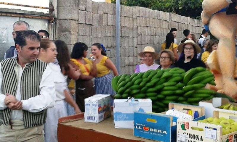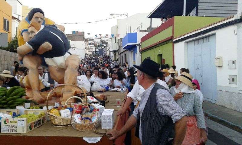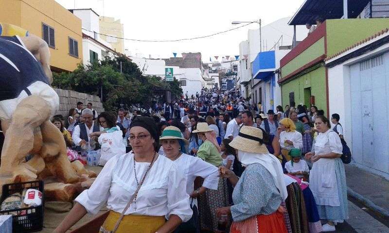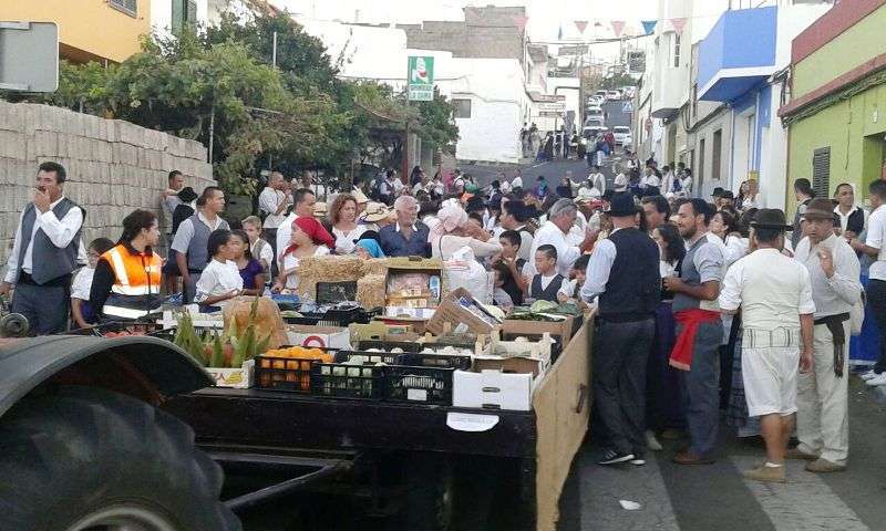 Después de llegar al pueblo por la calle Francisco Suárez Rivero y bordear la plaza envuelta en un gran jolgorio y ambiente festivo, la comitiva se detuvo a los pies del santuario de las Nieves para rendir honores a la patrona del barrio, imagen que ostenta el título de alcaldesa mayor y perpetua de la ciudad de Telde. Los alimentos que se entreguen en esta ofrenda irán destinados a las familias con escasos recursos.
