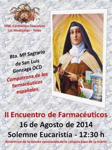 Telde.- Telde acogerá el próximo 16 agosto el II encuentro de farmacéuticos. Tendrá lugar en el Convento de la Santísima Trinidad y San José de las MM Carmelitas Descalzas de Las Medianías con la celebración de una solemne eucaristía a las 12.30 horas presidida por el reverendo James Nicol. Es el día beata María Sagrario de San Luis Gonzaga, farmacéutica, carmelita descalza y mártir, declarada ya compatrona de los farmacéuticos españoles.