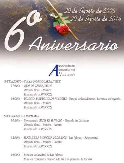 Telde.- El municipio de Telde acoge el año más un acto por un nuevo aniversario del accidente aéreo del vuelo de Spanair, el JK5022, que se estrelló en Barajas el 20 de agosto de 2008. En el sexto año tras la tragedia se llevarán a cabo diversos homenajes, entre ellos en la playa de Ojos de Garza.