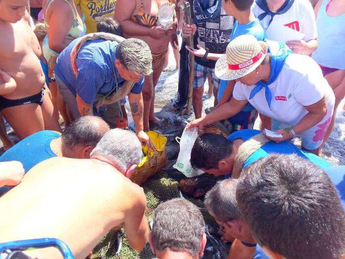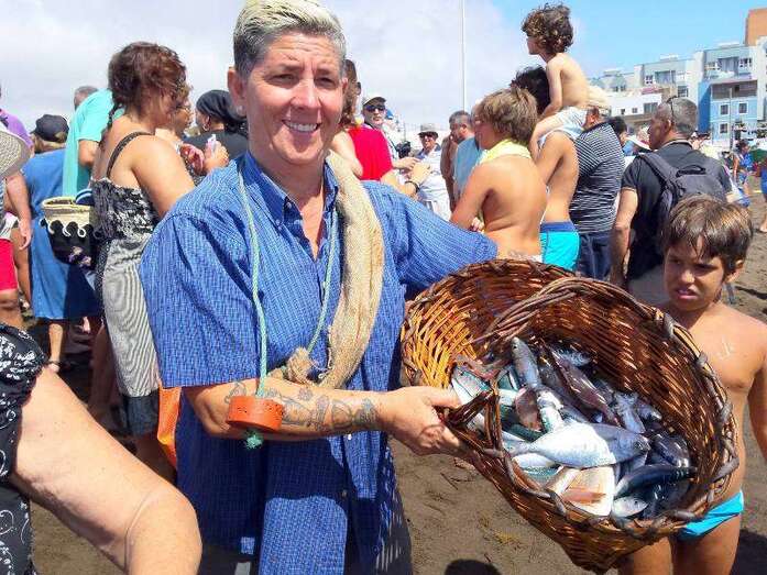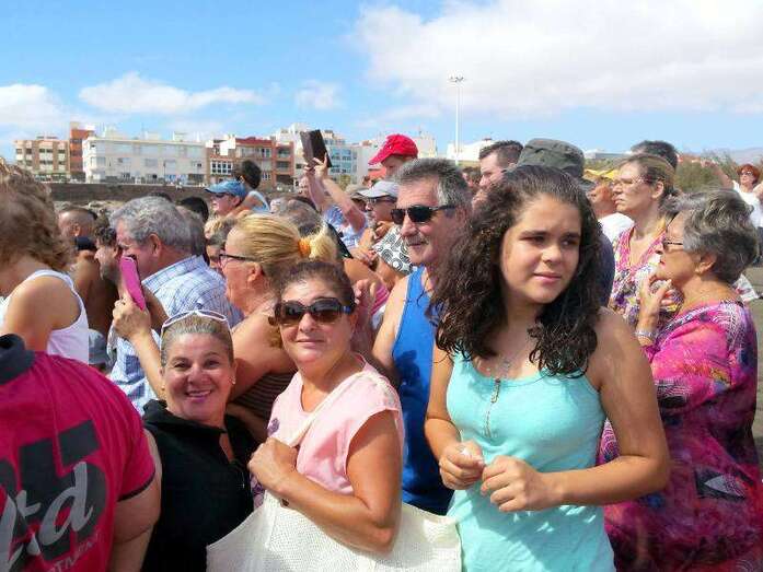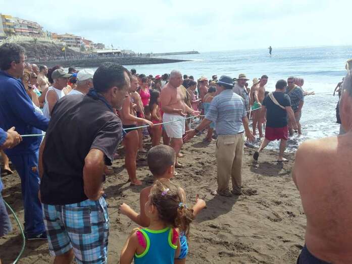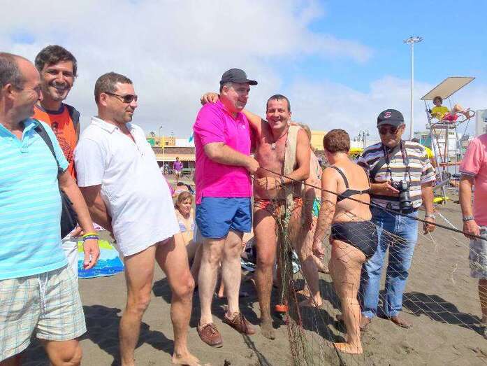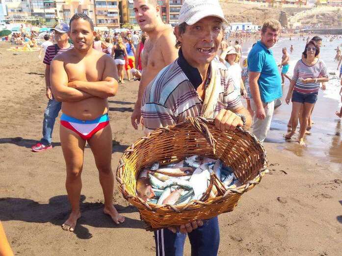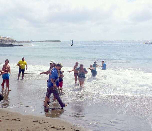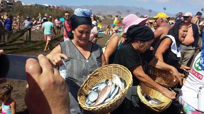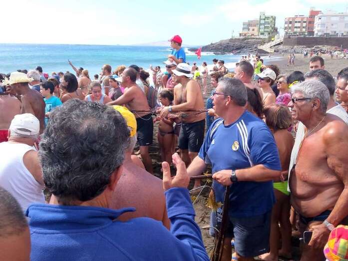 A las 10.00 horas, una embarcación a remo de los pescadores con sede en el muelle de Taliarte arribaba a la playa de Melenara, donde luego sus ocupantes, marinos de la zona, mostrarían el arte de pesca del chinchorro ya en desuso.