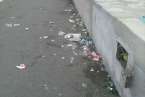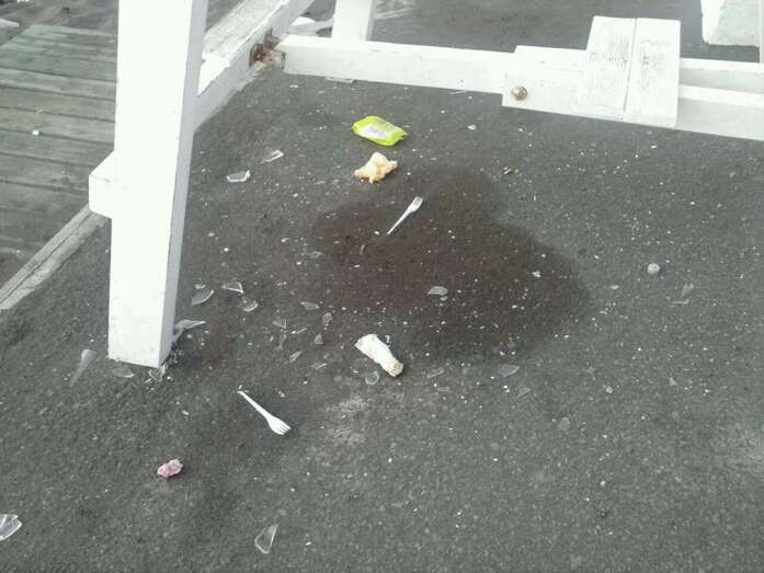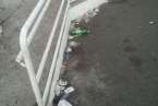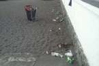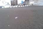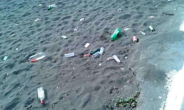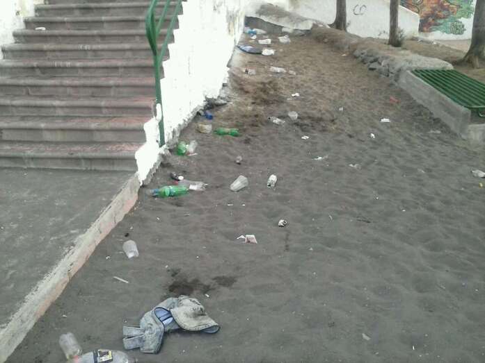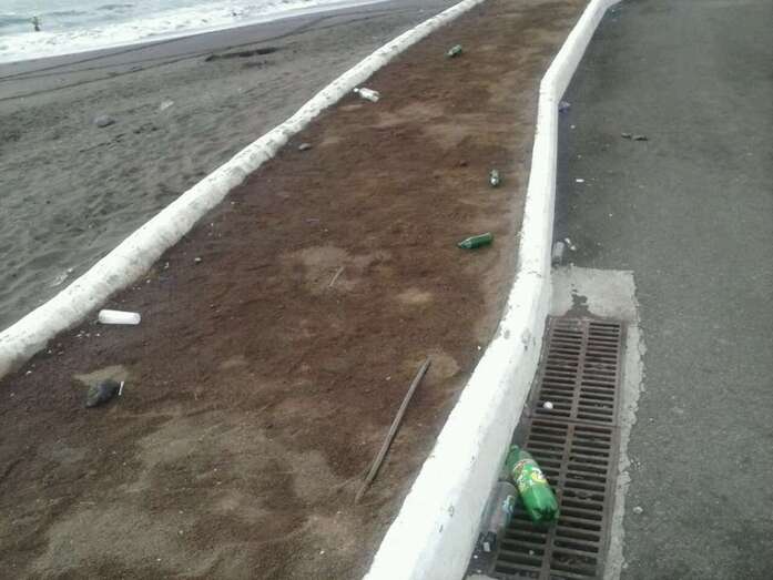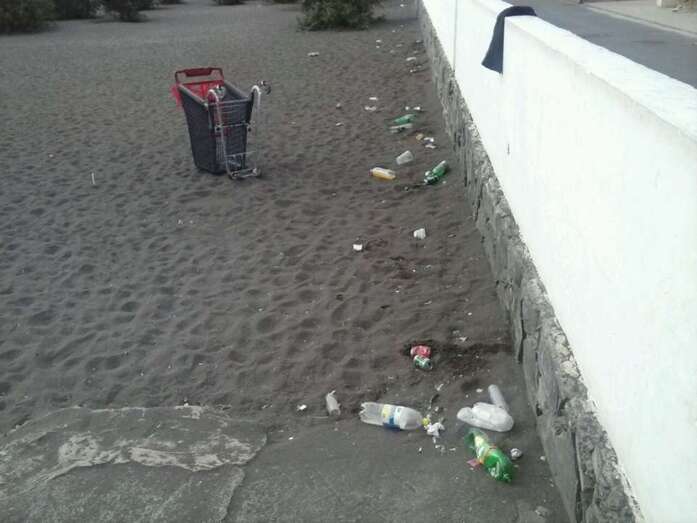 La entrada principal a la playa por calle de Palmera, donde se ubican las terrazas de los restaurantes, se encuentra totalmente colmada de basura. Abundan las botellas, cristales, bolsas de plástico y todo tipo de residuos.