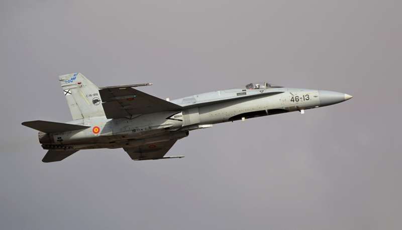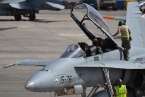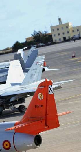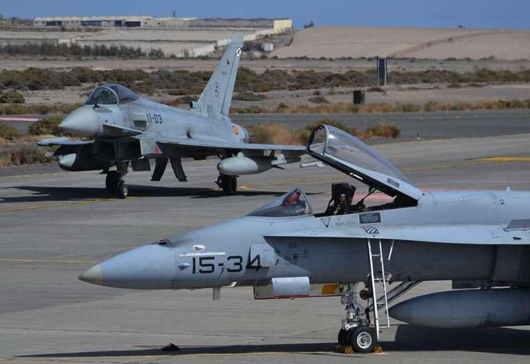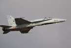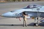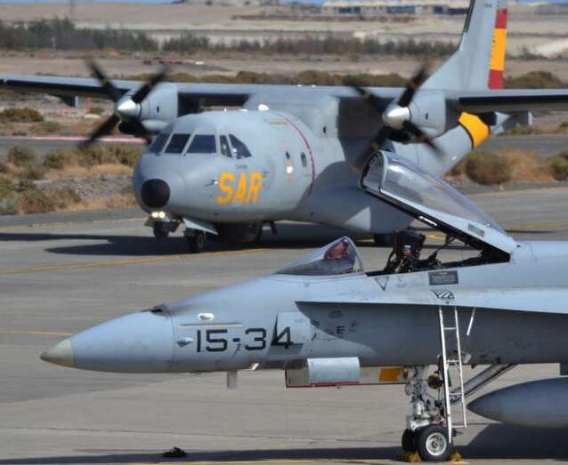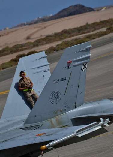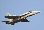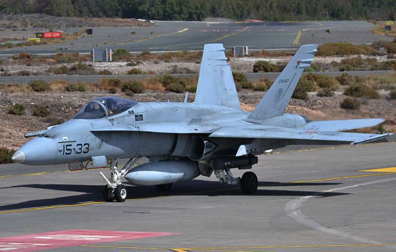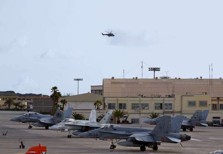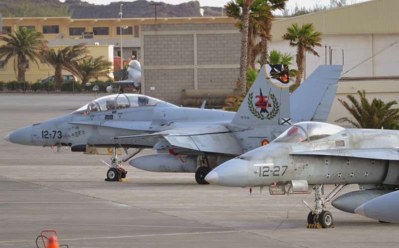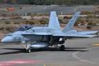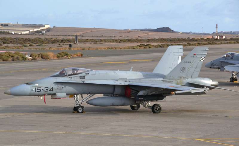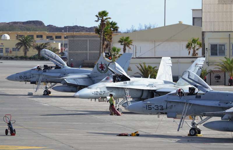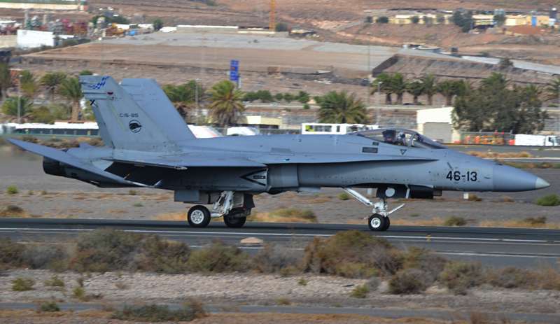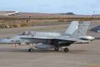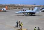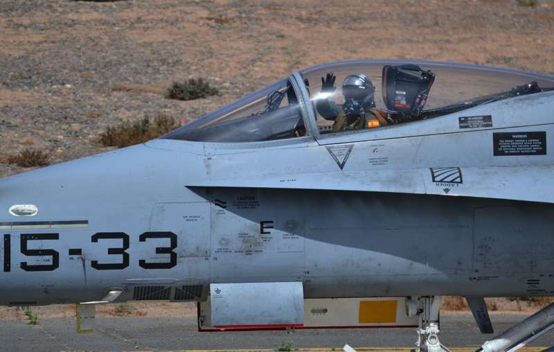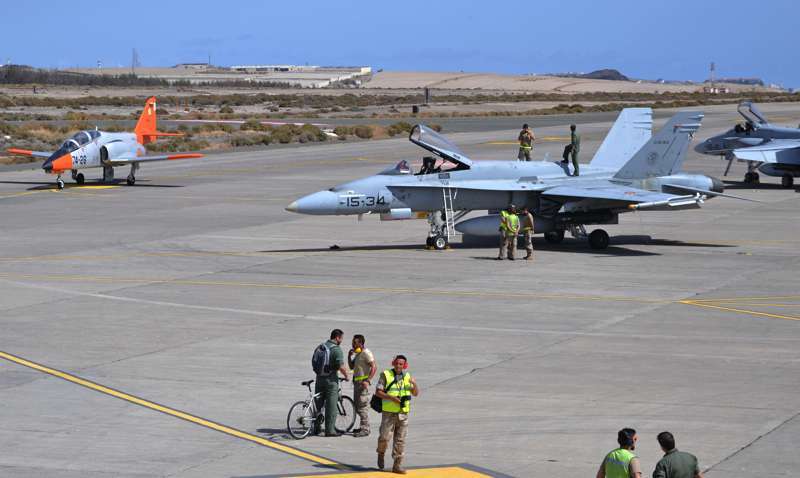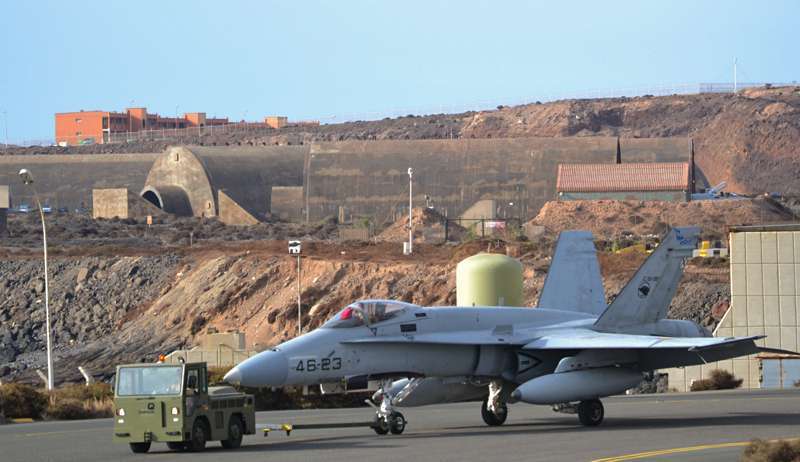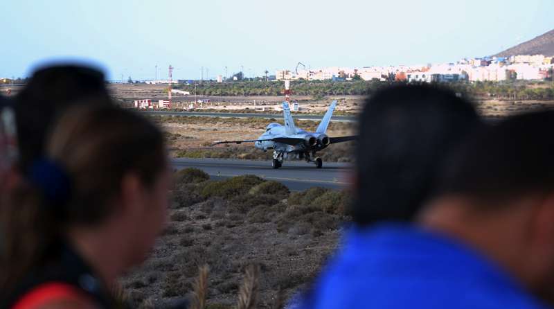 Uno de los F-18 destacados en el Ala 46 sobrevuela la Base Aérea de Gando (Foto Daniel Ojeda)