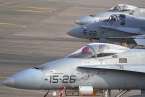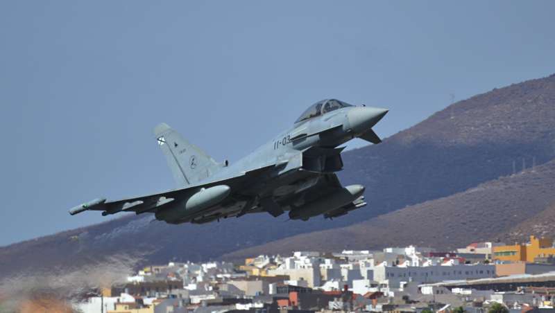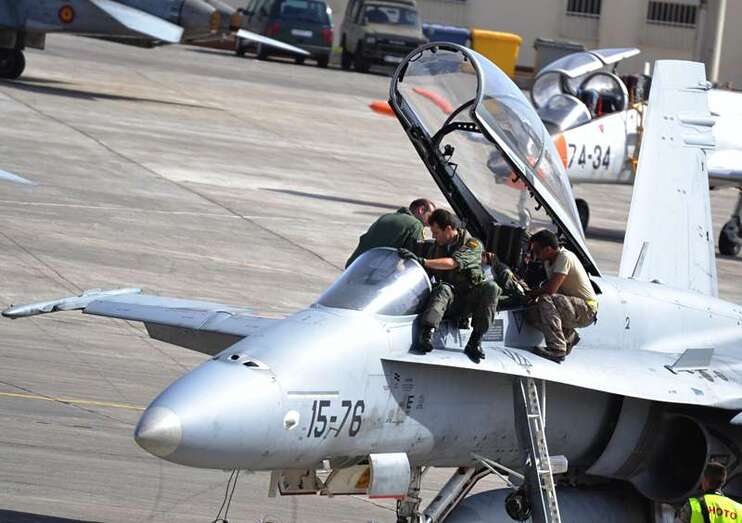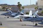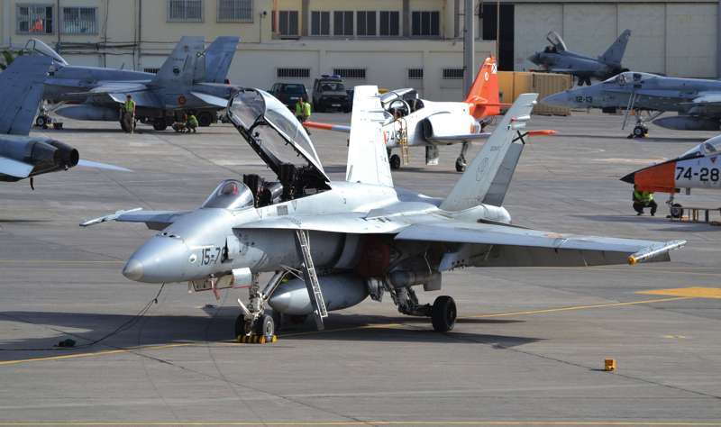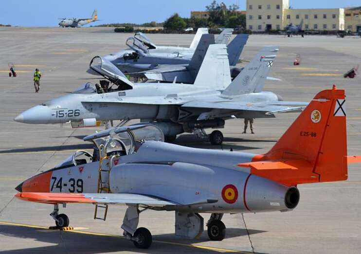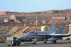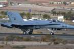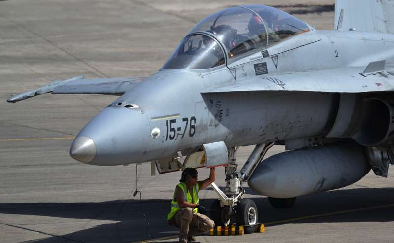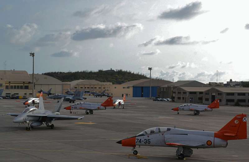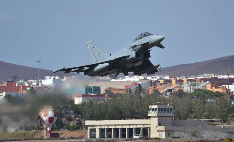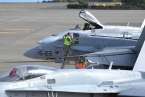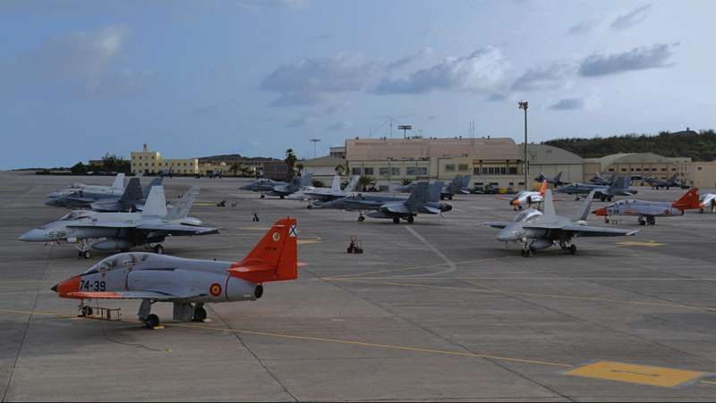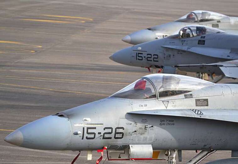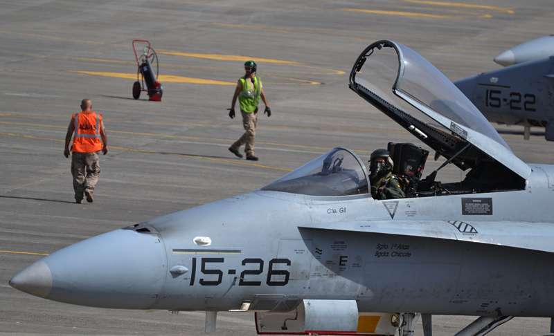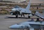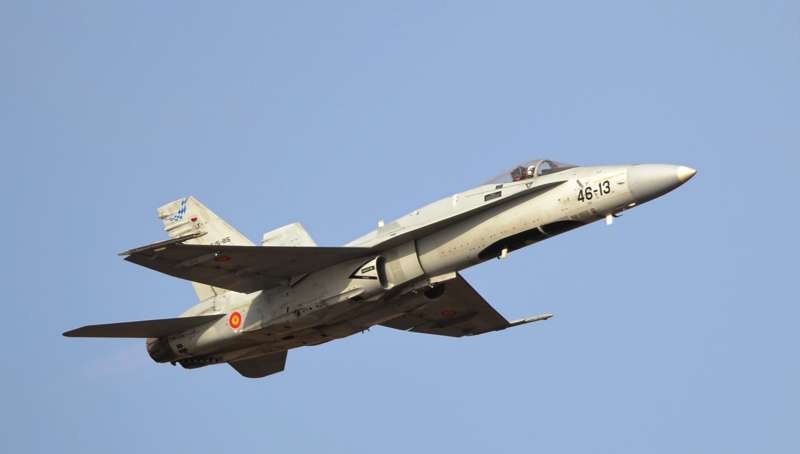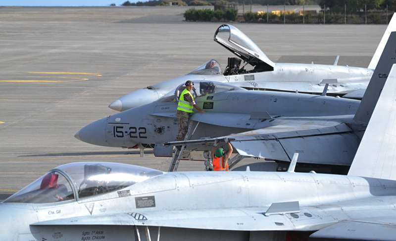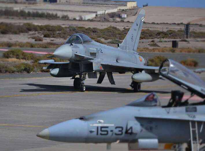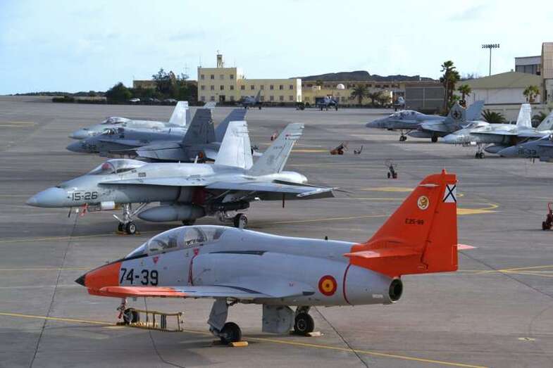 Uno de los F-18 destacados en el Ala 46 sobrevuela la Base Aérea de Gando (Foto Daniel Ojeda)