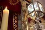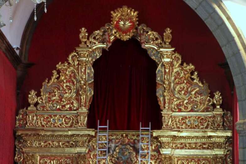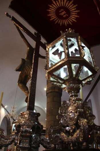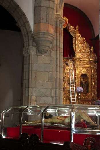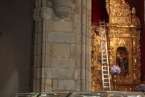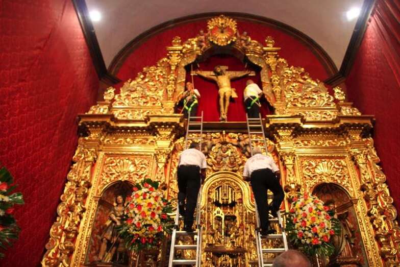 Luces internas que desde diferentes puntos de la arquitectura gótico mudéjar de la Basílica nos transfieren la idea del mensaje humano y divino: Yo soy la Luz de la Vida. Luces artificiales y naturales que desde los ventanales cuyas vidrieras filtraban unos efectos lumínicos de gran belleza, obras de arte, derramando luz y color sobre sus tallas, pinturas, trípticos, capillas, y, como fondo el gran escenario del retablo del altar mayor, con la hornacina vacía que en la tarde noche, después de la misa, en su ascenso por las escaleras que ya están preparadas, volverá a ser ocupada por la imagen sagrada, en su regreso o subida del Cristo. Hasta este momento y durante estos días pasados el Santo Cristo ha ocupado el lateral izquierdo, rodeado de ornamentos florales y cuatro faroles, que le dan el perfecto cuadro religioso, artístico del conjunto, en extraordinaria conjunción con el resto del templo. Motivo, simplemente, para postrarse y admirar la talla del Cristo de los tarascos de Michoacán, en Méjico, que hoy, lunes 22 de septiembre regresa a su hornacina en lo alto del Altar Mayor.