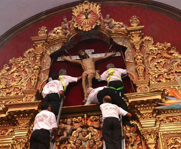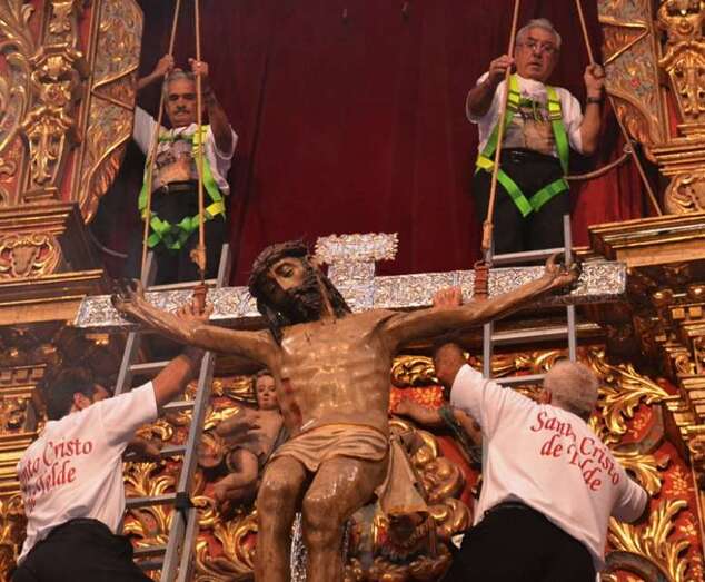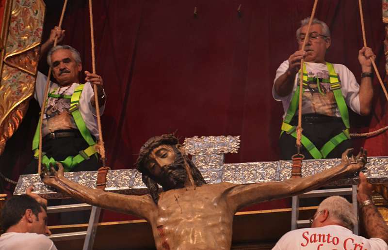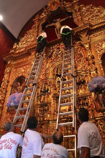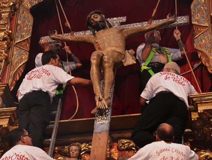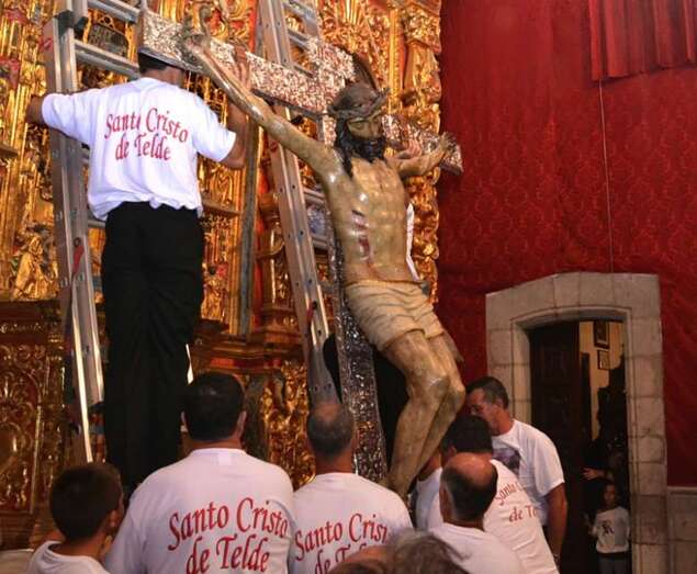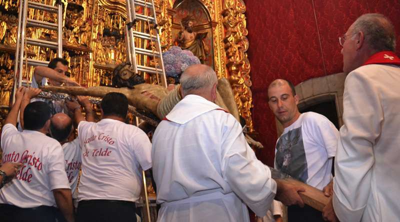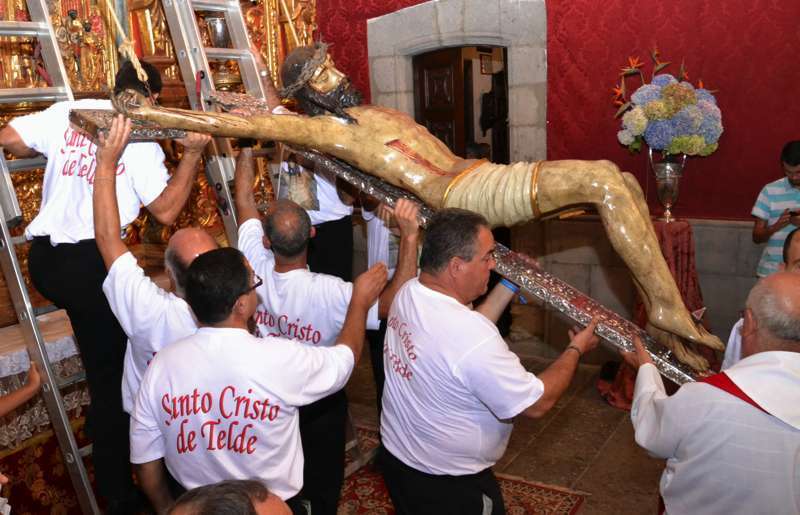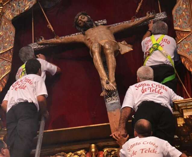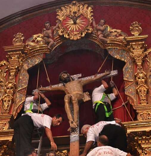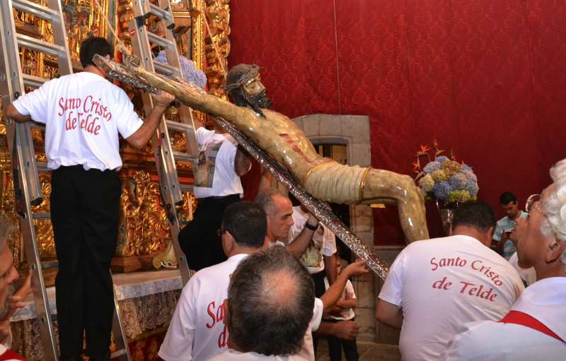 En ese instante se desataron los vivas, las lágrimas y los aplausos de la muchedumbre. Poco a poco, con una apacible cadencia, la imagen fue ascendiendo con serenidad hasta ser depositada en la hornacina del retablo flamenco. La Banda de Música de Telde puso fin a la ceremonia interpretando la canción y el himno dedicado al Santo Cristo.