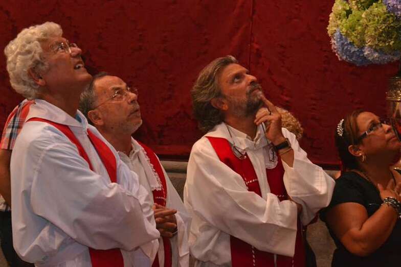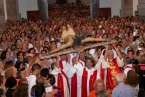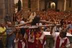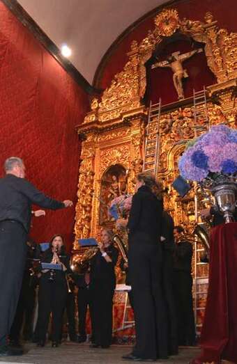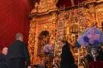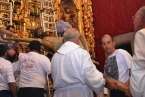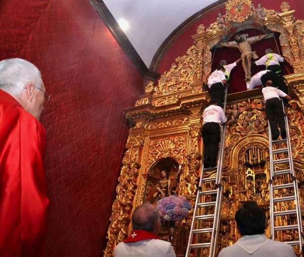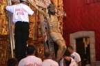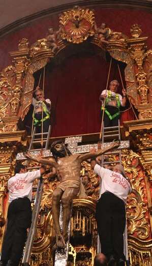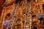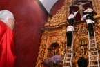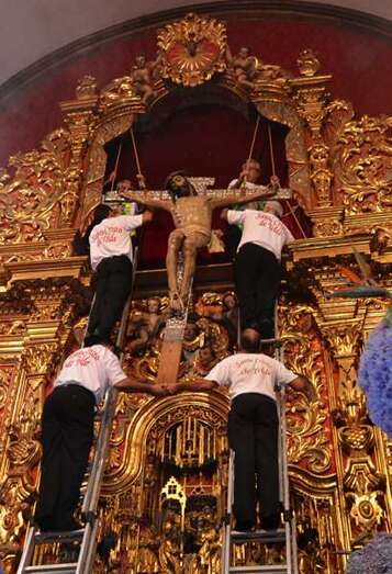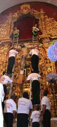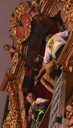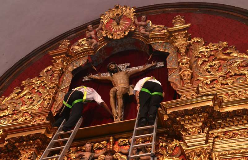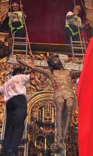 Fueron precisamente los clérigos los encargados de trasladar a la efigie, modelada en el siglo XVI por los indios tarascos de México, desde su torno móvil, ubicado a los pies del presbiterio, hasta el Altar Mayor en donde la entregaron a los seis porteadores que con ayuda de dos escaleras y dos sogas la devolverían a su santuario habitual, en lo alto del templo.
