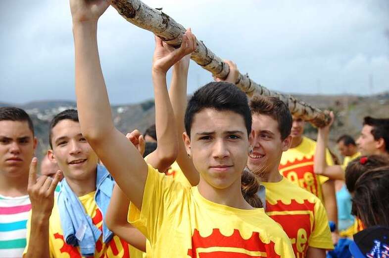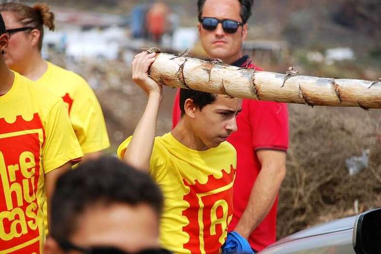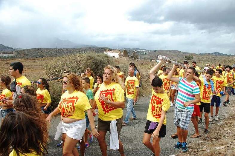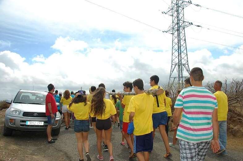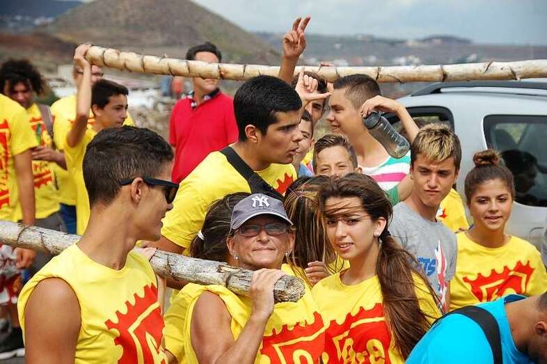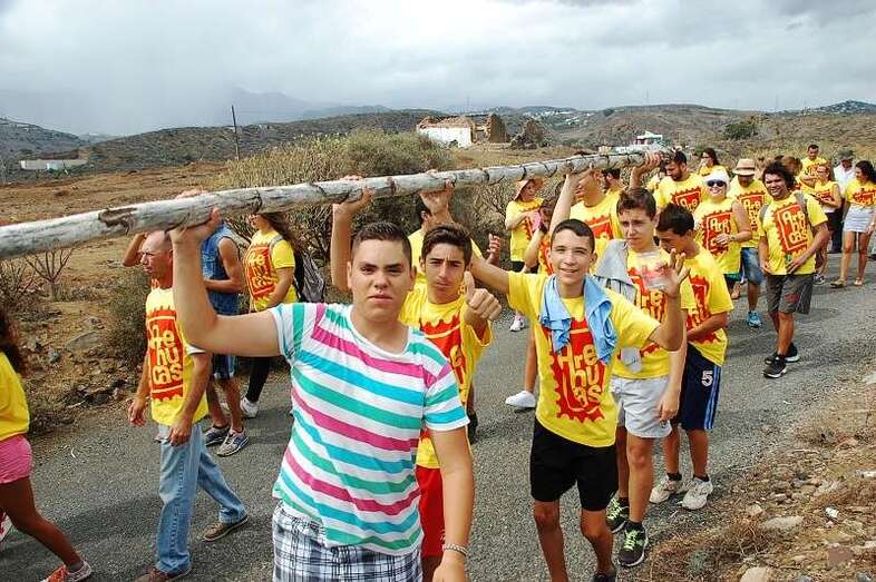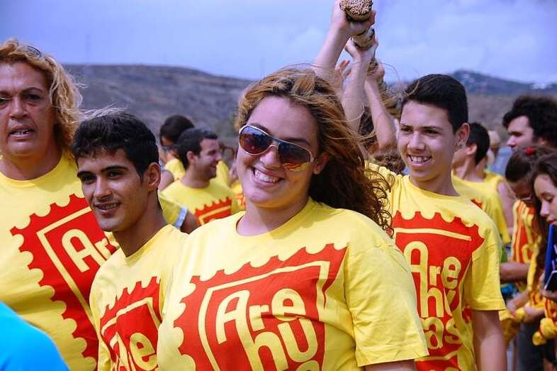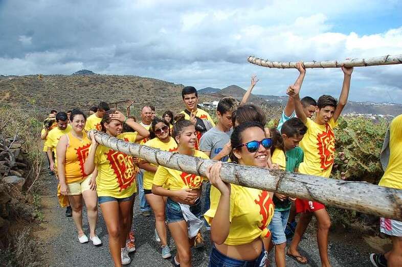 La fiesta comenzó a las 12.15 horas. Adultos, jóvenes y niños llegaron hasta los dominios del campo de volcanes de Jinámar, donde se abre misteriosa la Sima, y vinieron bailando, ataviados la mayoría de ellos con llamativas camisetas amarillas de la firma Arehucas hasta el pueblo, hasta Caserones Altos, trayendo a hombros dos lustrosos troncos de pita. Uno lo levaban los hombres, otro, las mujeres.