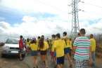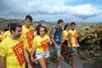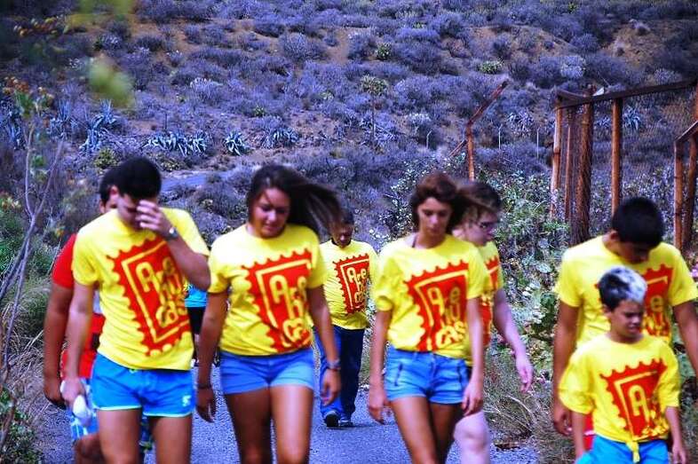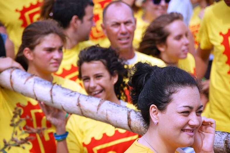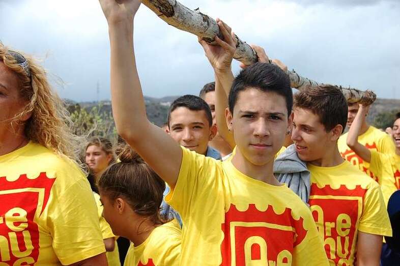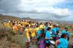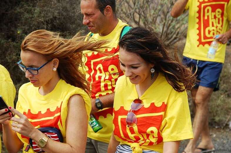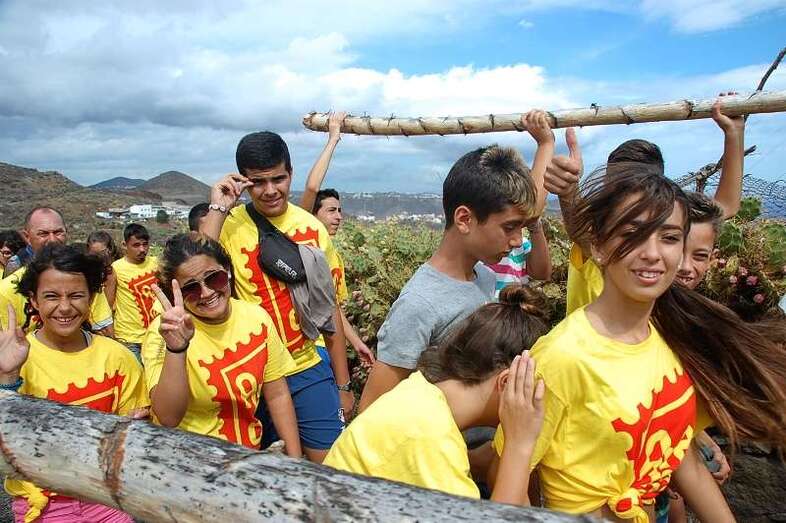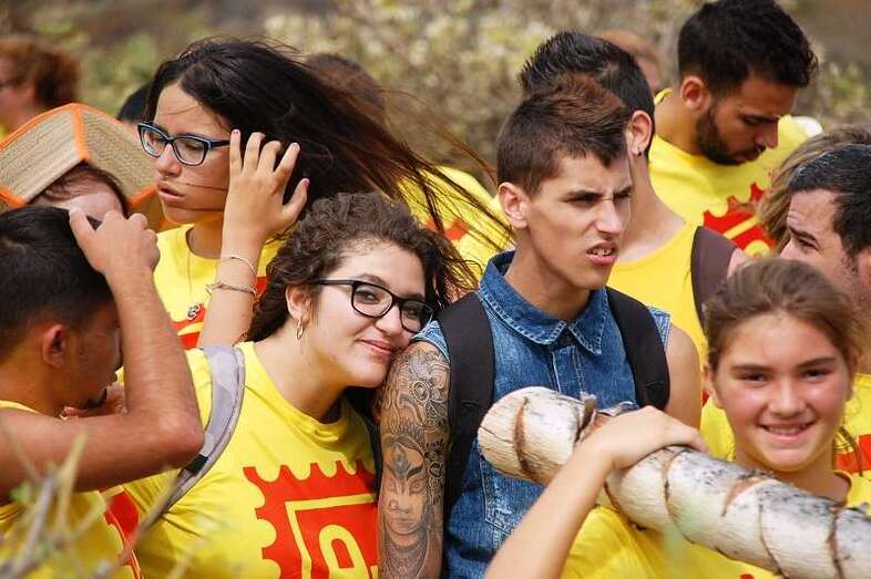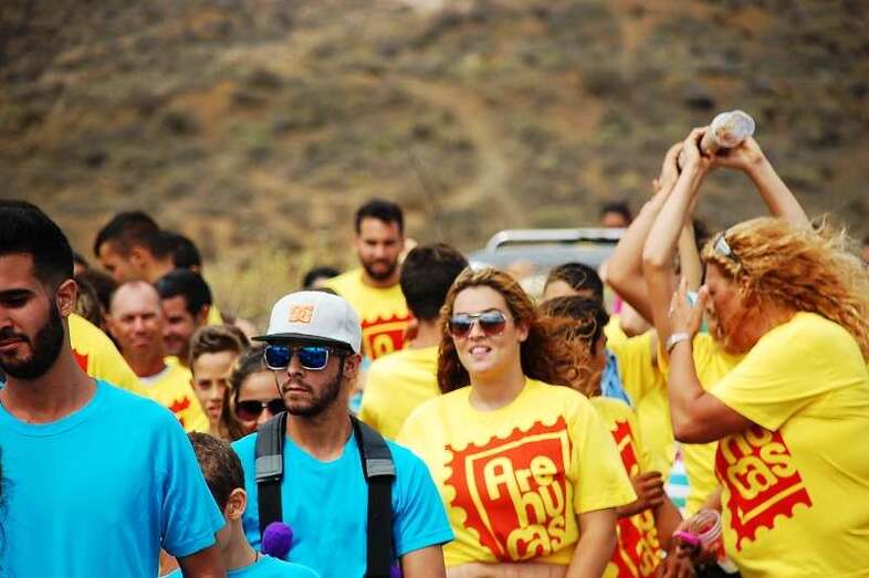 La fiesta comenzó a las 12.15 horas. Adultos, jóvenes y niños llegaron hasta los dominios del campo de volcanes de Jinámar, donde se abre misteriosa la Sima, y vinieron bailando, ataviados la mayoría de ellos con llamativas camisetas amarillas de la firma Arehucas hasta el pueblo, hasta Caserones Altos, trayendo a hombros dos lustrosos troncos de pita. Uno lo levaban los hombres, otro, las mujeres.