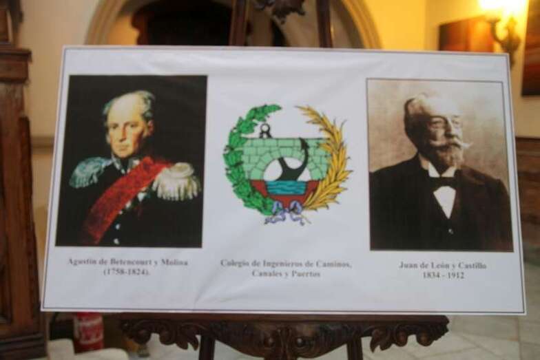 Después de la invitación a un cocktail despedimos la sala de entrada del Gabinete Literario con las imágenes de dos ingenieros, canarios ilustres que desde su tiempo marcaron el conocimiento de la ingeniería futura, Agustín de Betencourt y Molina (1758-1824) y Juan de León y Castillo (1834-1912), y el emblema de los Ingenieros de Caminos, Canales y Puertos. Mi agradecimiento a María Teresa Cabrera, Cronista Oficial de Valsequillo, coordinadora del acto por la información ofrecida. Muchas gracias.
