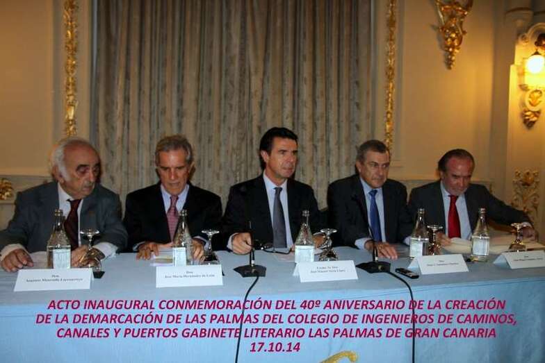 El viernes 17 de octubre el Excmo. Sr. Ministro de Industria, Energía y Turismo, don José Manuel Soria López procedió a la inauguración de los actos conmemorativos del 40º aniversario de la creación de la Demarcación de Las Palmas del Colegio de Ingenieros de Caminos, Canales y Puertos. Los actos tuvieron lugar en el salón dorado del Gabinete Literario de Las Palmas de Gran Canaria. En la mesa presidencial don José María Hernández de León, Decano de la Demarcación de Las Palmas del Colegio de Ingenieros de Caminos, Canales y Puertos. El Presidente Nacional de dicha institución don Juan A. Santamera Sánchez. Don Augusto Menvielle Laccourreye, Colegiado Medalla al Mérito Profesional del Colegio de Ingenieros de Caminos, Canales y Puertos 2013, don Juan Miguel Sanjuan y Jover, Vicepresidente del Gabinete Literario de Las Palmas de Gran Canaria.