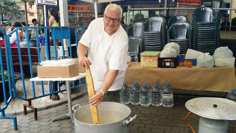 El cocinero del apartotel Il Rondo, sito en el Sur grancanario, se puso a la tarea muy pronto, ya que tenía por delante la tarea de elaborar un gran potaje canario con numerosos ingredientes con capacidad suficiente para repartir entre 350 y 400 raciones. Montesinos explicó que para el condumio emplea 10 kilos de berros, 6 kilos de judías pintas, 10 kilos de costillas y 10 kilos de zanahorias, además de papas, calabazas, habichuelas, batata, calabacines y pinas.