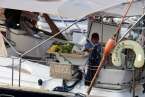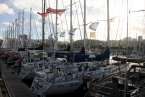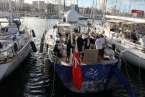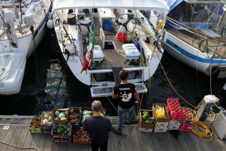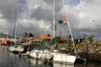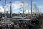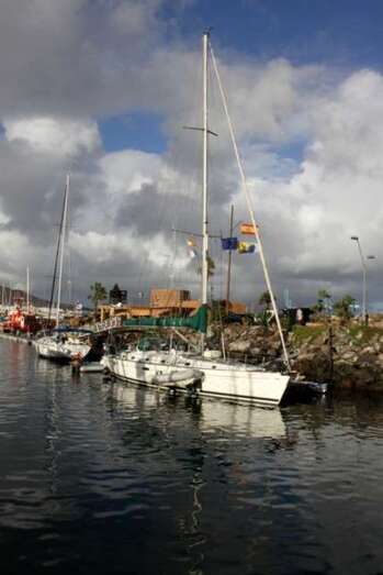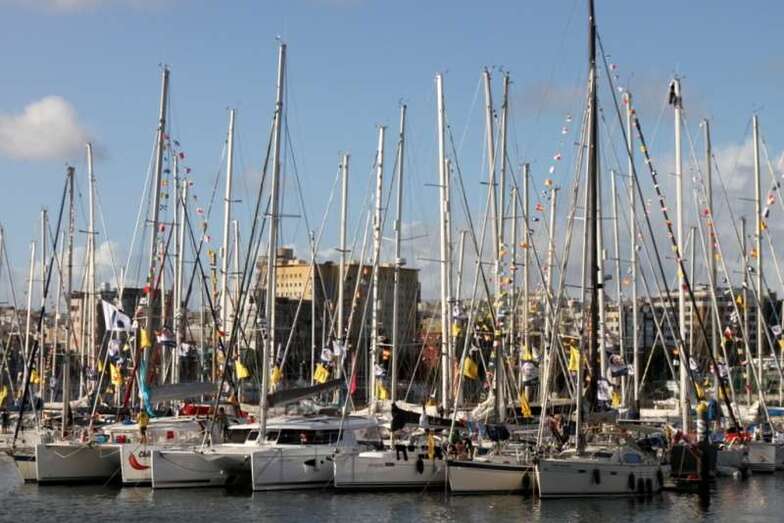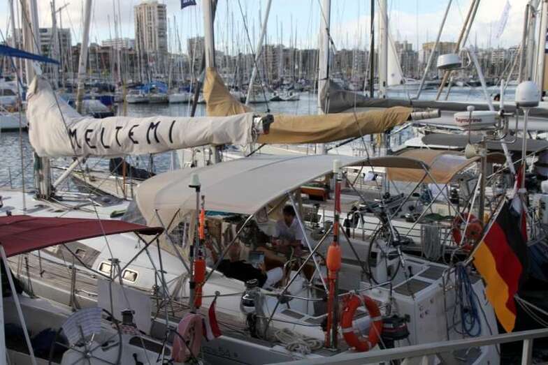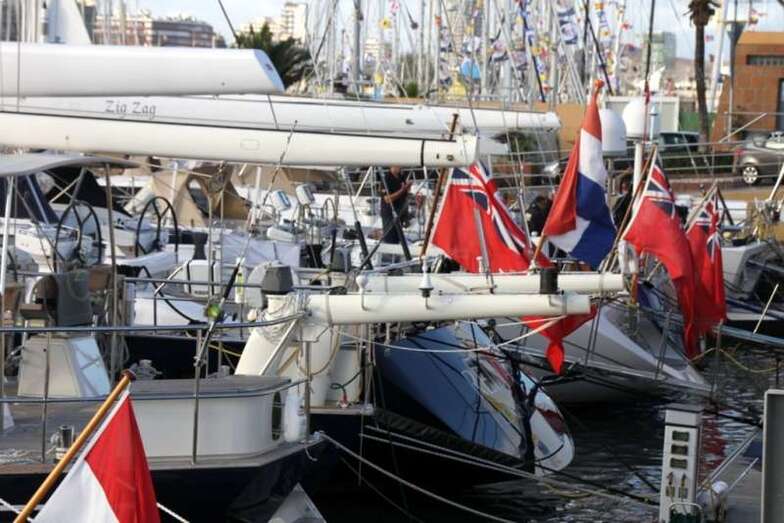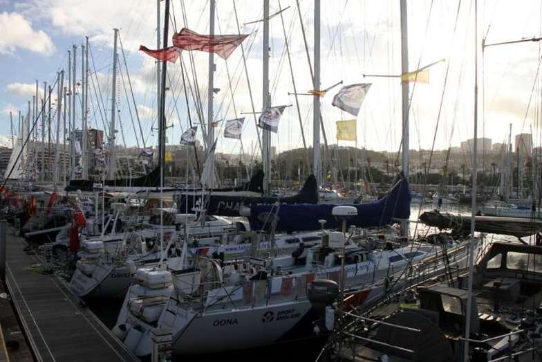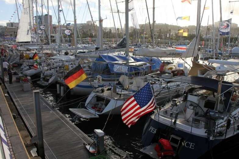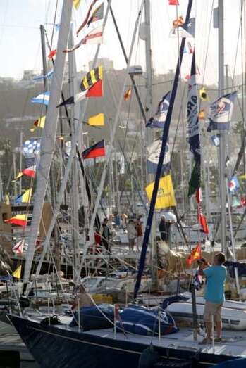 La tarde de este sábado 22, a lo largo y ancho del Muelle Deportivo los tripulantes realizaban sus últimos preparativos para poner a punto todo lo necesario para comenzar una de las aventuras de ocio náutico más interesantes. Por todos los pantalanes y sobre las escalas que, apoyadas sobre las popas, se disponían a cargar las definitivas compras necesarias, alimentos, bebidas, otros enseres, etc. Intendencia necesaria en sus planes logísticos de navegación y mantenimiento, para cruzar el Atlántico. Idas y venidas en taxis, bicicletas articuladas, cajas de toda clase de frutas, verduras, racimos de plátanos que como curiosidad de momento lucían su amarillo verdoso bajo las velas recogidas y mástiles desnudos.