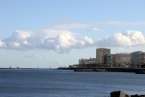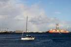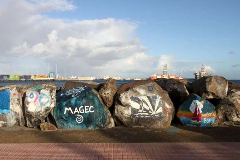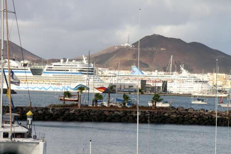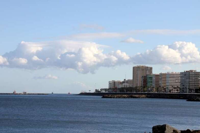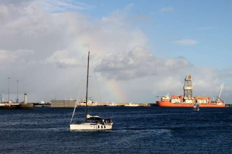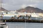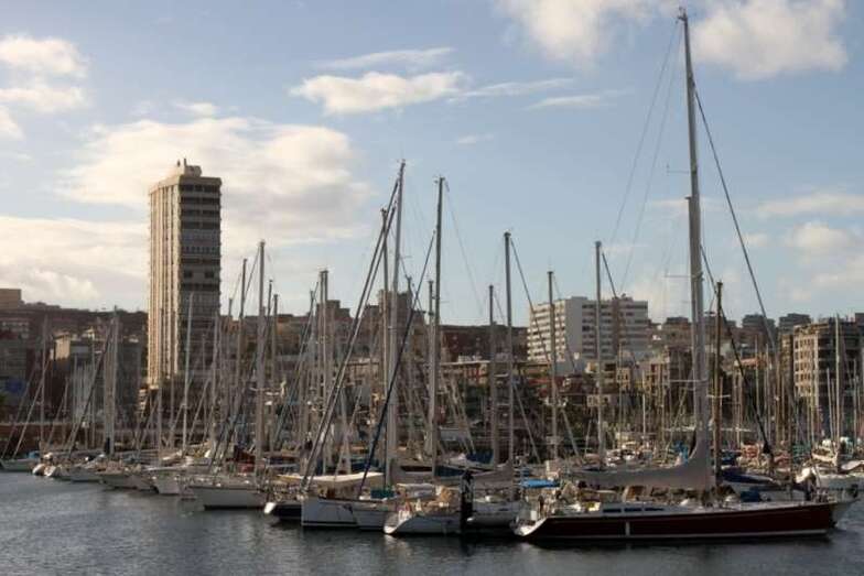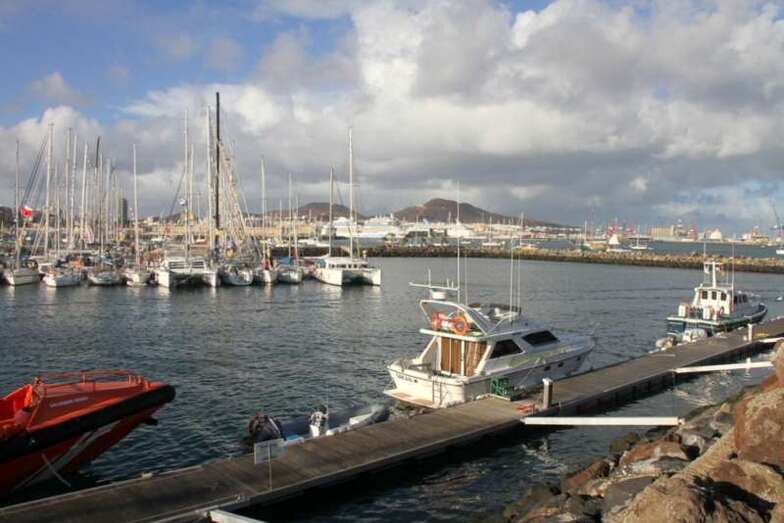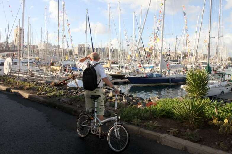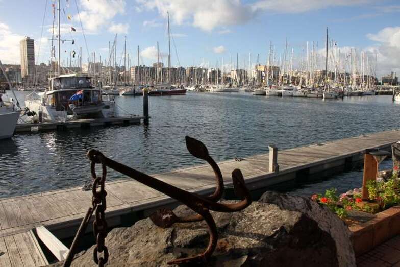 En verdad un hermoso y siempre atractivo paisaje frente a la ciudad que a lo largo de toda la línea de horizonte de la Avenida Marítima y Ciudad Alta, nos deja ver tras el entramado de mástiles, cables, banderolas y coloristas quillas de los veleros desde el Muelle Deportivo. Y el Puerto de La Luz, en toda su amplitud, a lo lejos el escondido Muelle Santa Catalina, oculto por los grandes cruceros que nos visitan y nos hacen llegar miles de visitantes, buques de lujo que partirían horas más tarde, y un Muelle Reina Sofía que, enfrente sobre su largo y longitudinal dique, dejaba ver como pinceladas de una pintura rápida los sucesivos cambios meteorológicos anunciados en forma de nubes, lluvia ligera, arco iris perdiéndose entre todo el horizonte y las plataformas de prospecciones petrolíferas, buques fondeados en la bahía y algún que otro velero probando sus últimas reparaciones.