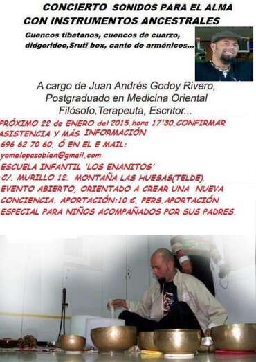 El día 22 de enero, a las 17.30 horas, tendrá lugar un concierto de sonidos para el alma con instrumentos ancestrales a cargo de Juan Andrés Godoy Rivero, postgraduado en medicina oriental, filósofo, terapeuta y escritor. Los asistentes podrán descubrir los cuencos tibetanos, de cuarzo, didgeridoo, sruti box y cantos de armónicos. Es necesario confirmar asistencia aunque se trata de un evento abierto con una aportación de 10 euros por persona.