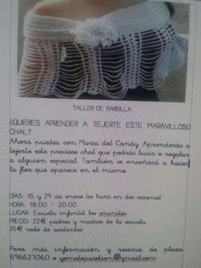 La primera de las actividades se celebra este jueves, además del 29 de enero, en dos sesiones. Se trata de un taller de barbilla para aprender a tejer un chal de la mano de María del Candy. Se desarrolla entre las 18.00 y las 20.00 horas y cuesta 22 euros para padres de la escuela y 25 euros para el resto de asistentes