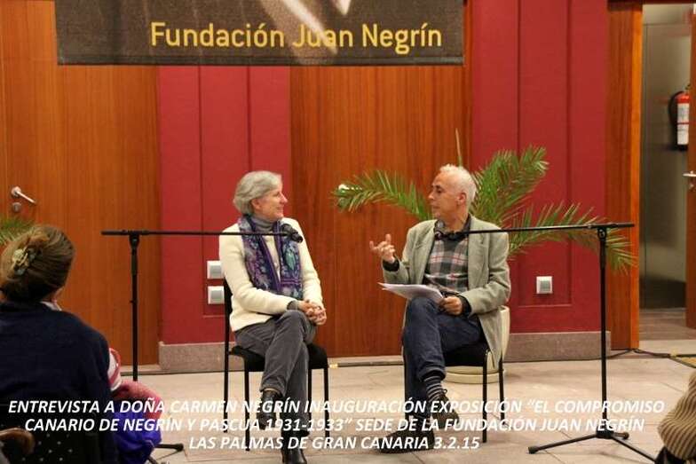 El redactor jefe de La Provincia/Diario de Las Palmas, Javier Durán realiza una entrevista abierta a doña Carmen Negrín, Presidenta de Honor de la Fundación, nieta del científico y político, previa a la inauguración de la interesante y documentada Exposición comisariada por el periodista Diego Talavera, muestra de una época en que el estadista Juan Negrín López y Marcelino Pascua, como Director General de Sanidad fueron elegidos diputados por la circunscripción de Las Palmas dentro de la Conjunción Republicano-Socialista, junto con Franchy y Roca, Bernardino Valle y Guerra del Río.