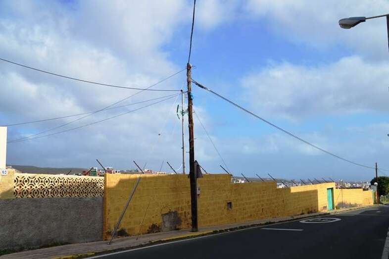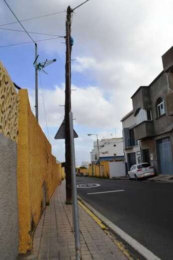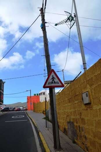 Telde.- Los vecinos del sector de El Ejido tienen que sortear un día y otro también un peligroso poste de madera y sus cables de agarre que están anclados sobre la acera derecha de la calle que sube en dirección hacia la llamada Casa de los Picos, un poco antes de llegar al colegio público Amelia Vega de Monzón. TA ofrece reportaje gráfico.
