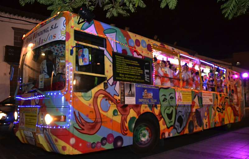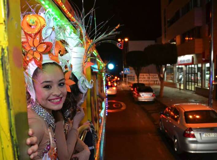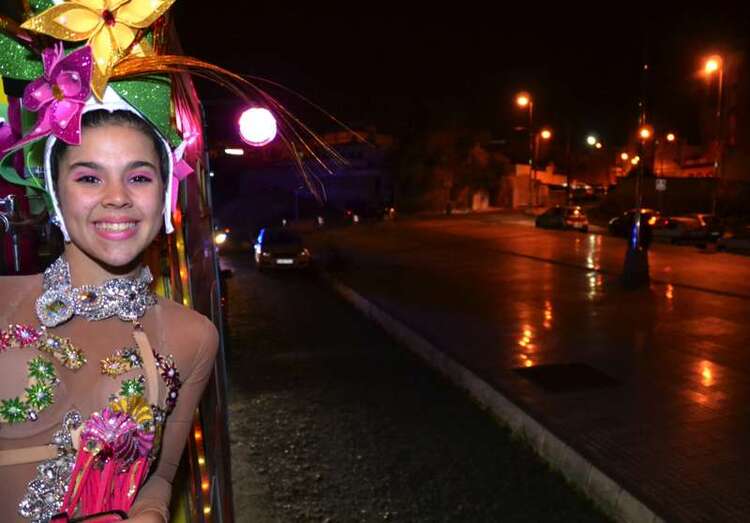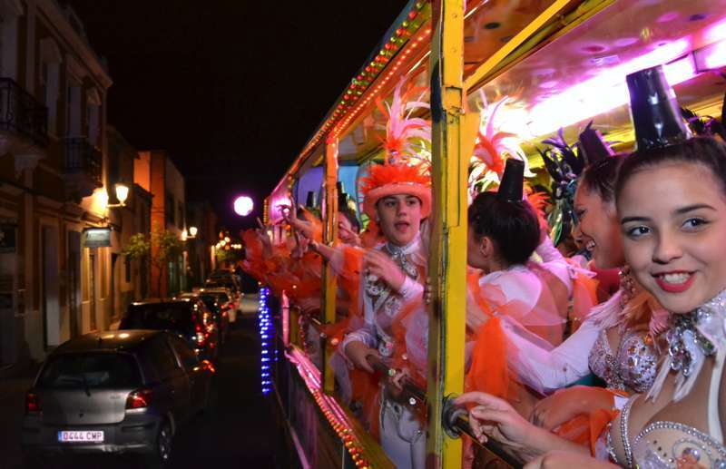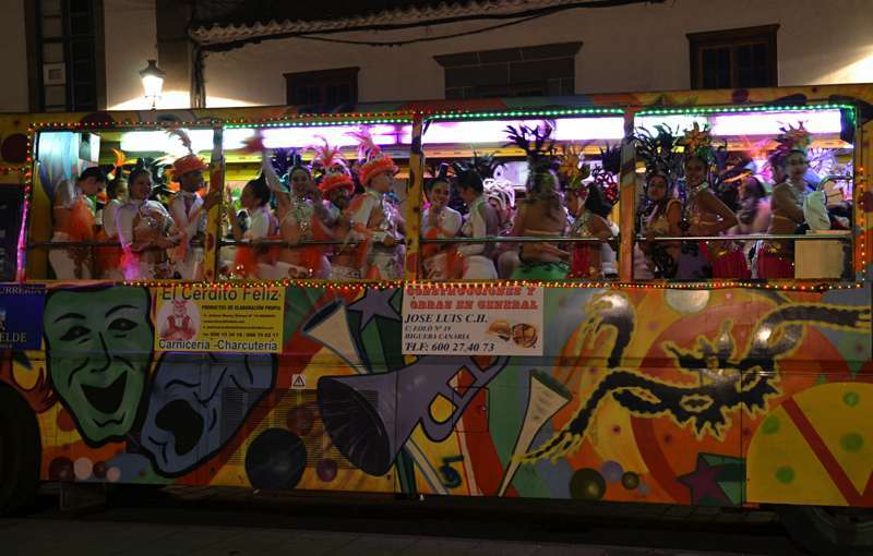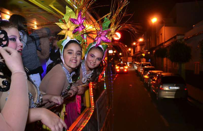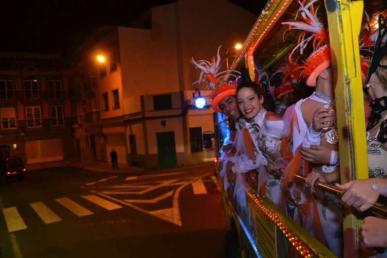 Para ir calentando el ambiente hasta el acto, la Concejalía de Festejos organizó un marchoso pasacalle anunciador a bordo de la carroza Las Pololas. La comitiva carnavalera, animada por las comparsas Lianceiros y Cubatao y con la música de los hermanos González, arrancó desde la plaza de San Juan al filo de las 20.30 horas, dando un toque festivo al casco urbano en una noche de temperatura ambiental bastante fría.