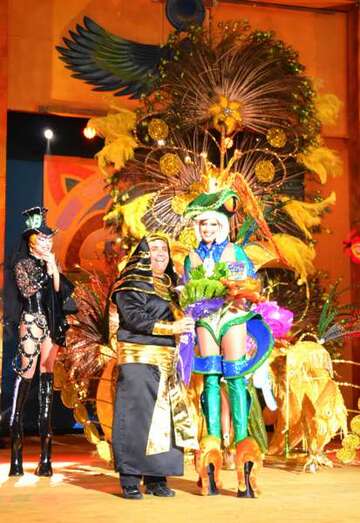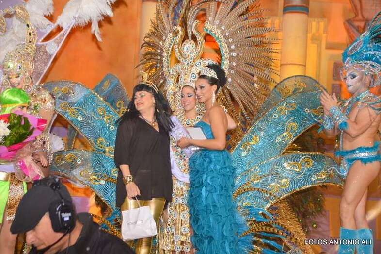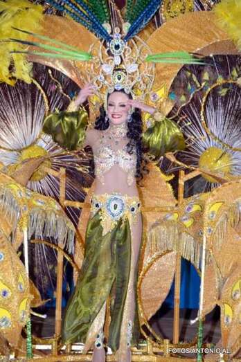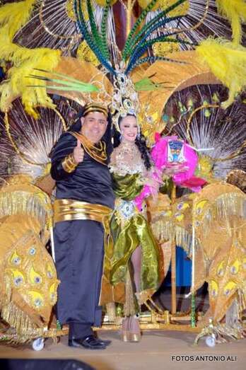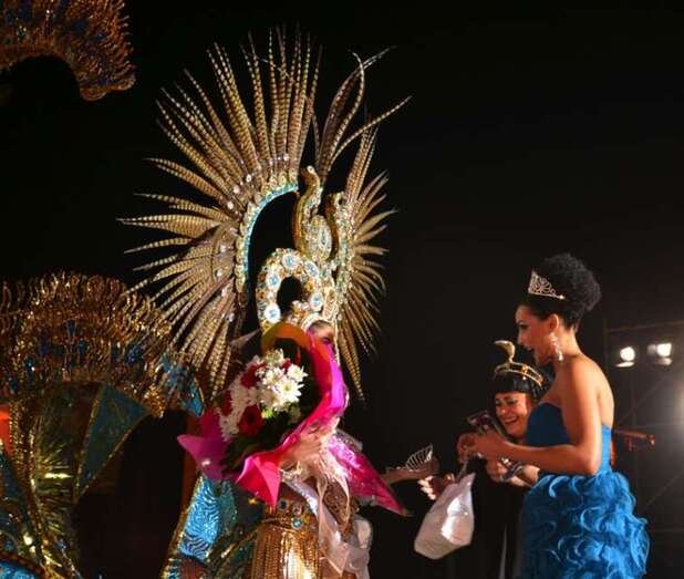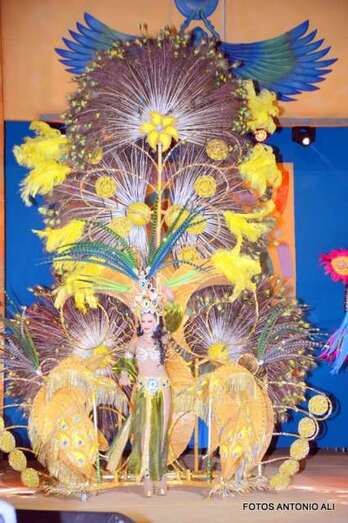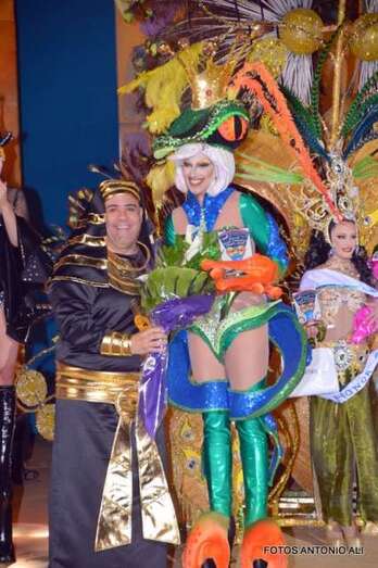 Azahar Morán Montesdeoca (19 años) representando a Comparsa Cubatao con la alegoría El Sol de Arabia, un diseño de Tito Cabrera. Le entregó la banda y premio de 300 euros el concejal de Festejos, Agustín Pérez.