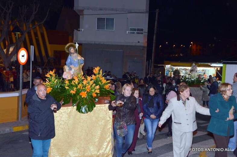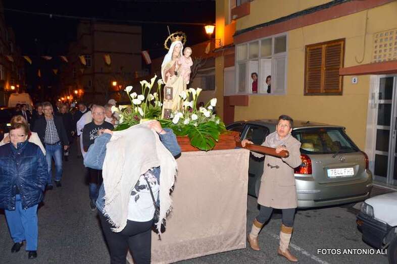 Telde.- El barrio teldense de San José de Las Longueras celebró esta noche la tradicional procesión del santo patrono por sus calles. Cerca de un centenar de personas acompañaron a la imagen de San José y de la Virgen del Carmen en un desfile religioso en el que irrumpió la lluvia.
