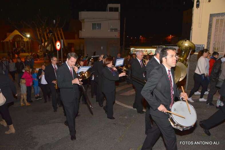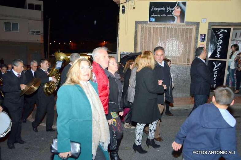 La procesión se ponía en marcha a los sones de la Banda Municipal de Música de Telde, para discurrir por el vecindario y los alrededores del templo. Decenas de feligreses, vecinos y autoridades locales e insulares arroparon a las imágenes de San José y la Virgen del Carmen durante un recorrido que se vio condicionado por el frío reinante y la lluvia que irrumpió a medio camino.
