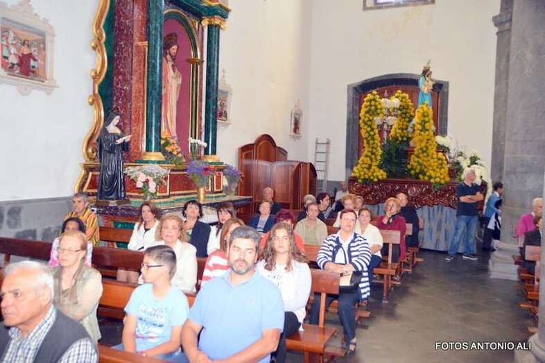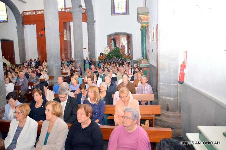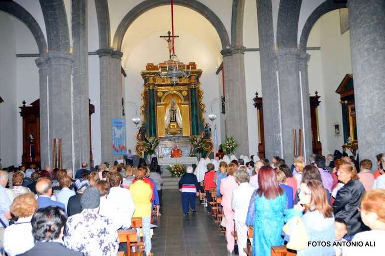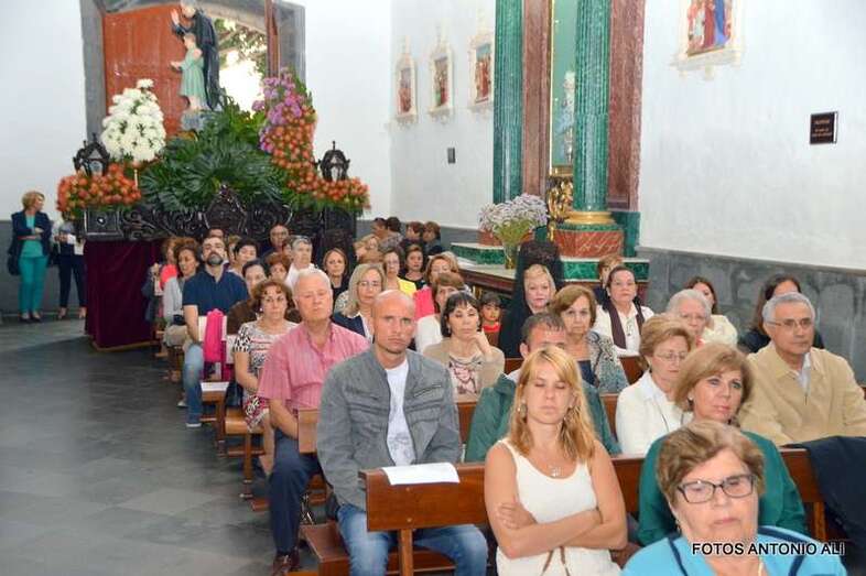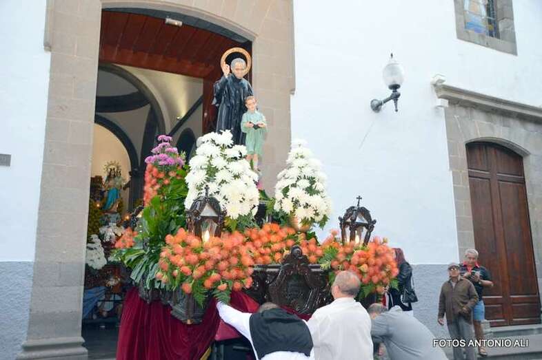 Tras la eucaristía oficiada a partir de las 19.00 horas por el párroco Luis Marrero en el interior del templo neoclásico del barrio, los tronos y su comitiva iniciaron su marcha al filo de las 20.15 horas, en la que llamó poderosamente la atención la vistosidad de los trajes de los participantes y las grandes banderas que estos portaban.