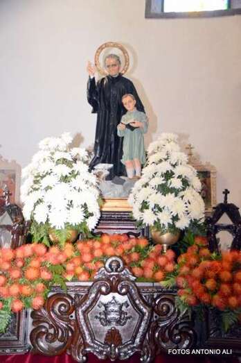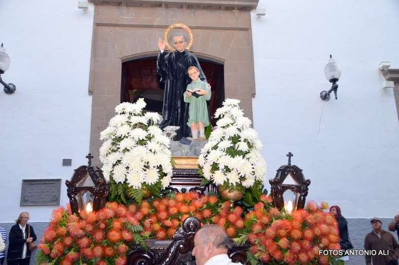 Los tronos con las imágenes de San Juan Bosco y de María Auxiliadora, trasladadas desde el Colegio Salesiano la Iglesia de San Gregorio para celebrar esta festividad, salieron las dos por primera vez en procesión por las vías principales del núcleo comercial en dirección al centro educativo, acompañado de antiguas alumnas y de un amplia comitiva de estudiantes y profesores del colegio salesiano de Telde.
