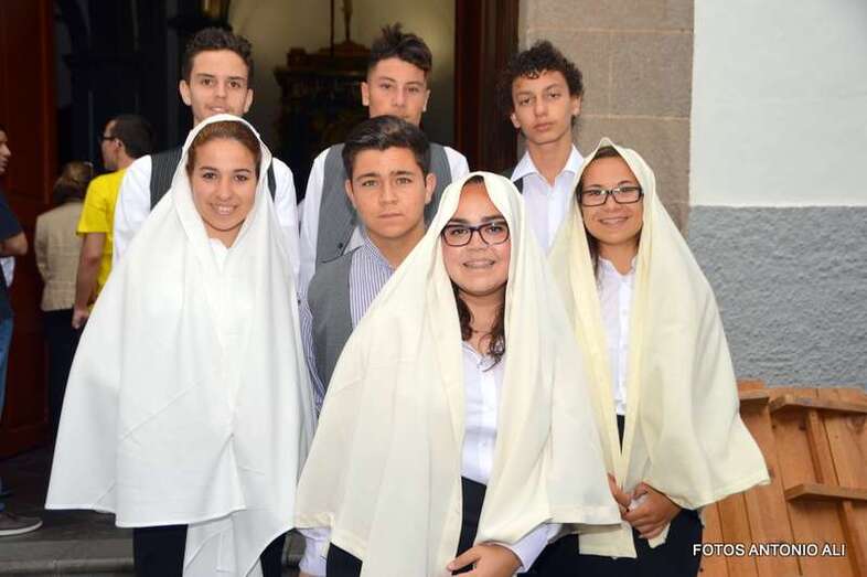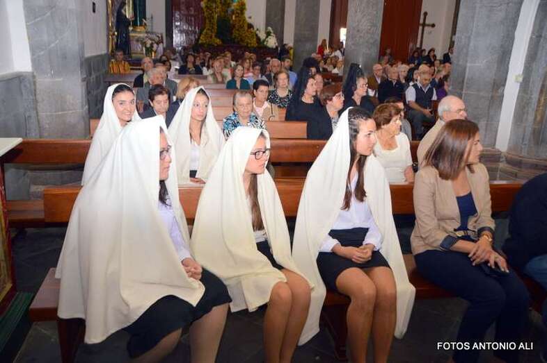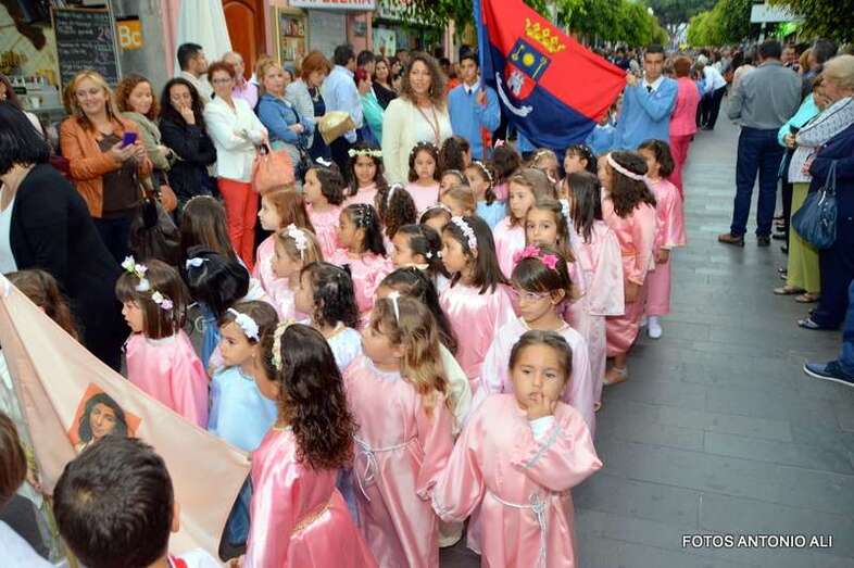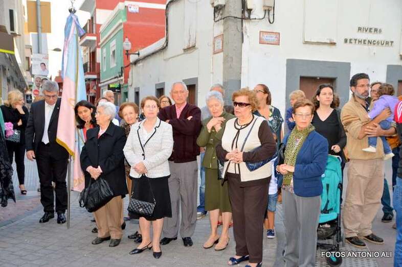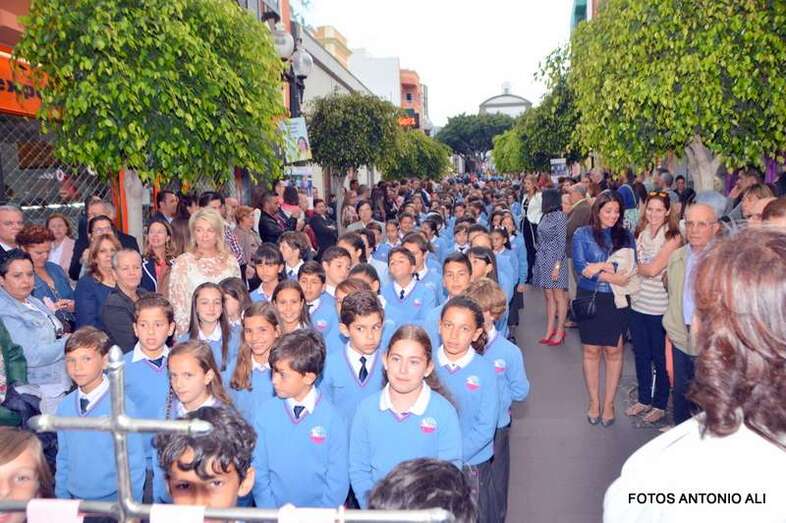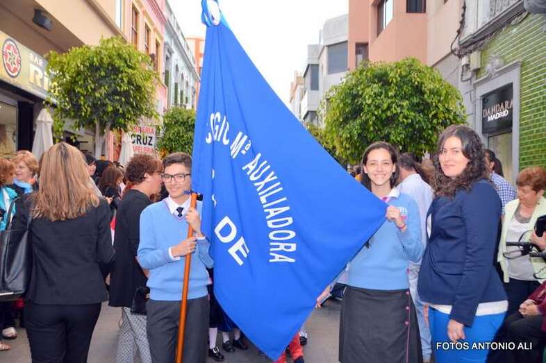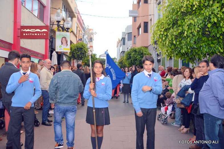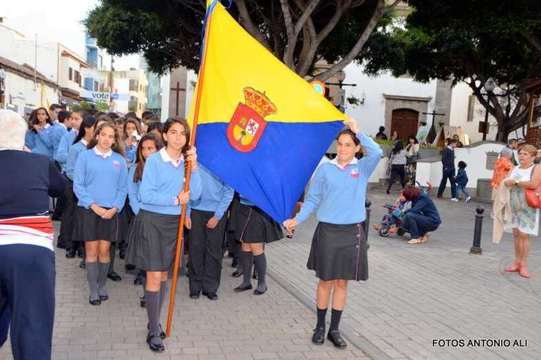 Con sus estandartes y banderas, la comitiva religiosa que organiza anualmente la comunidad salesiana de Telde desde más de 60 años, abrió sus puertas en 1949, contó con el acompañamiento de cientos de devotos y de alumnos del colegio, además de por más de decenas de mantillas de varias generaciones.