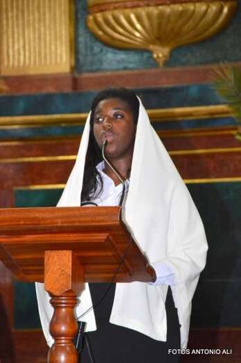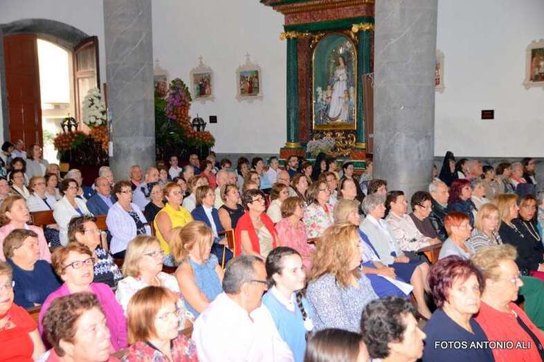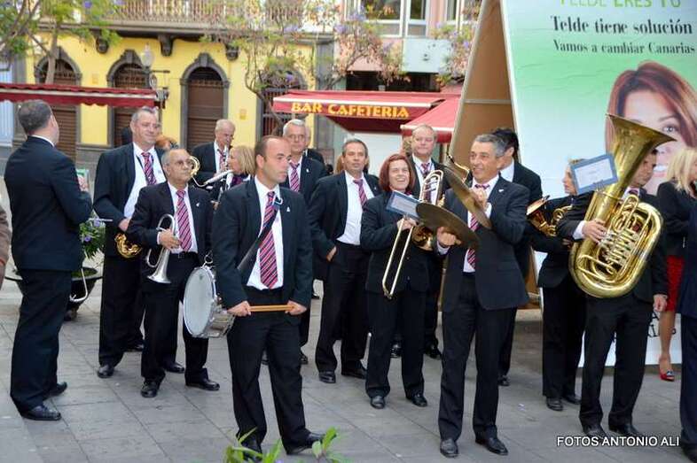 Después de la entrada de los tronos en el gran patio central y ubicado en un lateral, en medio de una gran ovación y aplausos se entonaron cánticos de bienvenida. Un precioso Ave María interpretado por Alejandra, alumna de la E.S.O. y el himno a María Auxiliadora acompañado por los componentes de la Banda Municipal de Música de Telde dirigidos por el director don José Martel Rodríguez.