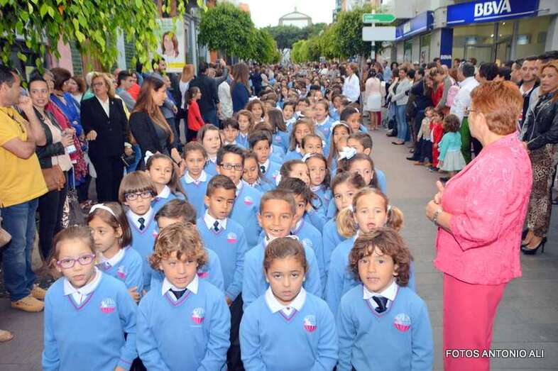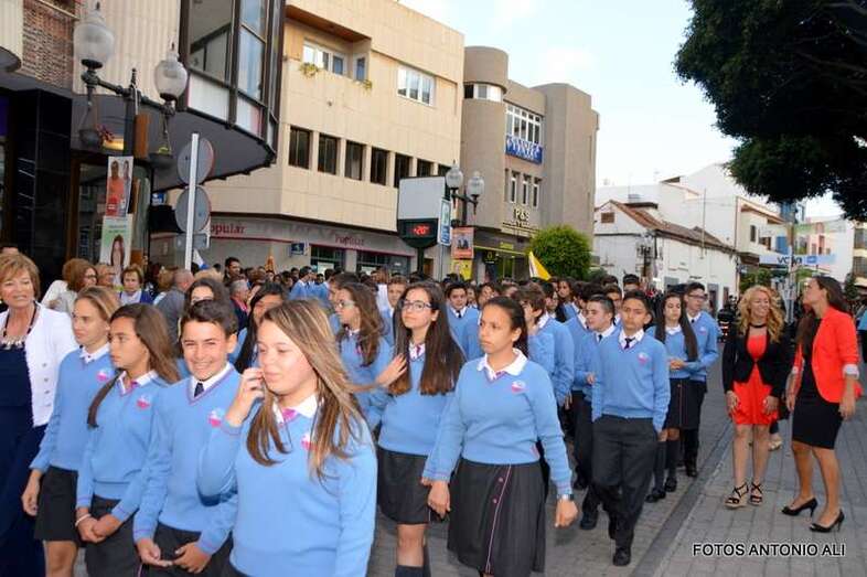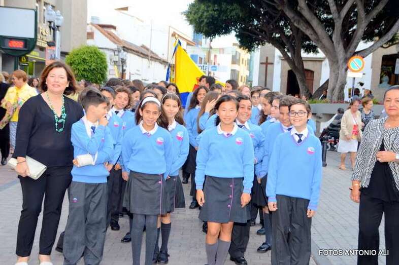 Como ya viene siendo tradicional, el trono de María Auxiliadora y de San Juan Bosco estuvieron acompañados en su paseo por las autoridades locales, la Banda Municipal de Música y, sobre todo, por los cerca de 700 alumnos que actualmente tiene censados este centro privado concertado que goza de gran prestigio en la isla.