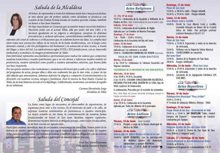 Al respecto, Hernández, tras desgranar la historia de la festividad y su relación con la fundación del barrio, hizo un llamamiento a todos los teldenses para que se sumen "con alegría" a los fastos en honor de San Juan Bautista y disfruten de todos los actos litúrgicos y festivos organizados, ya que aseguró que pese a la situació socioeconómica actual debe de existir un espacio para el disfrute colectivo.