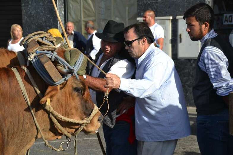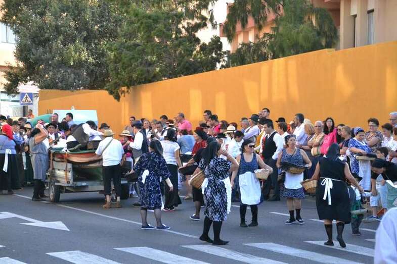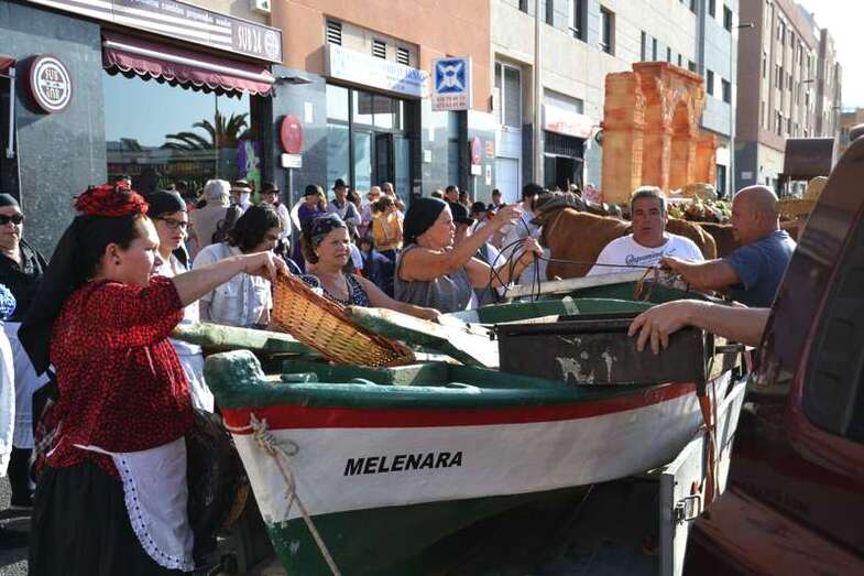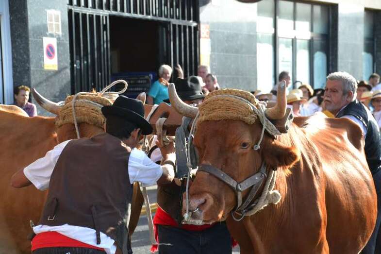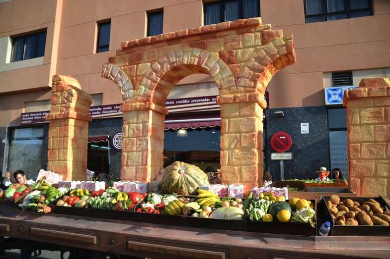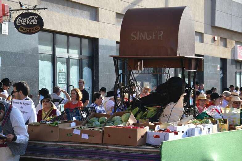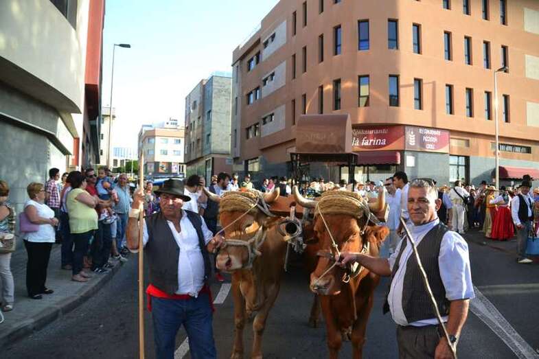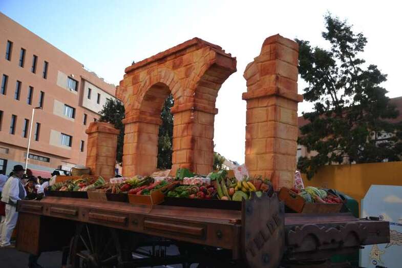Pasadas las 19.30, con media hora de retraso sobre el horario previsto por la organización, se ponían en marcha desde el sector residencial de Arnao las ocho carretas tiradas por yuntas de bestias de la tierra y que en su interior transportaban cientos de kilos de alimentos. Frutas, verduras, hortalizas y hasta cajas de pescado fresco que se entregaron posteriormente como ofrenda a la llegada del desfile popular al templo matriz de Telde, para que la parroquia y el grupo de Cáritas los distribuyan en las próximas horas entre las personas más necesitadas del municipio.